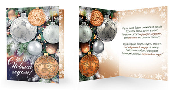 Открытка среднего формата с кратким пожеланием и украшенная отделкой из серебряной фольги поможет красиво оформить новогодний подарок другу или подруге, коллеге или близкому человеку. Открытка выполнена из плотного картона, поэтому надолго сохранит свой нарядный внешний вид.
