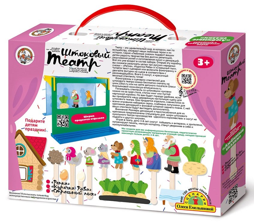 Handling time: 24 days Устроить настоящее театральное представление у себя дома совсем не так сложно, как может показаться на первый взгляд. Представления со штоковым театром от «Десятого королевства» не только доставят детям радость, но и создаст общую творческую атмосферу.В набор штоковых кукол и декораций «Любимые сказки», артикул 03680 входят:• Штоковые куклы – 11 персонажей (размер кукол – 15-21 см.): дед, бабка, внучка, собачка Жучка, кошка, мышка, ёжик, курочка, репка, яичко золотое, яичко простое.• Декорации – 3 шт: дом с окошками (левая кулиса), стол со скатертью, грядка.• Комплект липучек для крепления декораций.• Сценарии к сказкам «Репка» , «Курочка Ряба» , «Страшный Пых» (можно бесплатно скачать в разделе Поддержка или на сайте детского писателя Олеси Емельяновой ).Штоковый театр «Любимые сказки» рекомендуется для детей от 3 до 8 лет. Участвуя в представлении, ребенок развивает память, мелкую моторику, уверенность и коммуникабельность.Набор изготовлен из древесных материалов с элементами бумаги и пластиковой фурнитуры.Как устраивать спектакли с набором?Чтобы устроить полноценный спектакль, установите ширму (продается отдельно) в нужном месте, выберите сказку, которую хотите сыграть, и украсьте сцену декорациями.Спектакль можно показывать и без ширмы – из-за края стола, стопки книг или пустой картонной коробки.Раздайте роли юным актерам и играйте! Готовые сценарии и фонограммы подарят детям радость творчества без долгих репетиций, разучивания ролей и изготовления кукол и декораций. Просто откройте коробку – и театр у вас дома!Мы создали для вас информационно безопасную, педагогически грамотную развивающую театральную игровую среду, которая принесет максимум пользы детям. Расширьте свой домашний штоковый театр с другими наборами и куклами .
