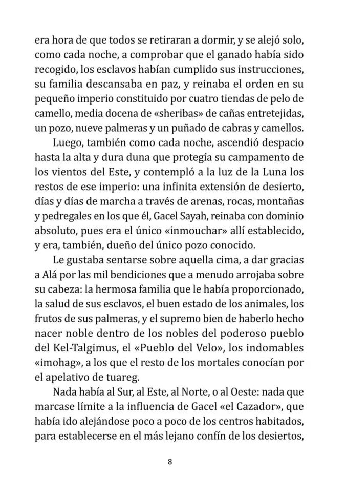 Handling time: 19 days «Туарег» — самый известный и издаваемый роман Альберто Васкеса-Фигероа. Это завораживающая история о людях африканского племени туарегов, живущих под солнцем, плавящим камни, о людях, гордых и непокорных, бережно хранящих свои традиции. Их неписаный закон гостеприимства ставится выше всех прочих законов. Поэтому после того, как в доме туарега Гаселя Сайяха военные убивают одного гостя и увозят другого, мужественный туарег на верблюде отправляется в пустыню, чтобы спасти похищенного. Роман принимает неожиданный оборот, когда правительство страны принимает решение отправить армию на захват Гаселя Сайяха. Кому мог помешать житель пустыни? Почему против него выступают военные части? И, самое главное, сумеет ли туарег отстоять справедливость? Роман не отпустит читателя до самой последней страницы. Книги на испанском языке / чтение на испанском / испанский язык книги / на испанском языке / тексты для чтения на испанском / читать книги на испанском / современный испанский / лексика испанского языка /испанский язык для школьников / испанский язык в оригинале / испанский язык / изучение испанского языка языка / тренажер по чтению на испанском / тренажер для чтения на испанском / книга на испанском языке / рассказы на испанском