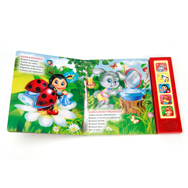 Handling time: 24 days "УМКА". ИДЕТ КОЗА РОГАТАЯ. (5 ЗВУКОВЫХ КНОПОК). ФОРМАТ: 200Х175ММ. ОБЪЕМ: 10 КАРТ. СТР. в кор.32шт Замечательная книга "Идёт коза рогатая" понравиться малышу. В ней размещены 10 веселых потешек: "Идёт коза рогатая", "Мальчик-пальчик", "Два весёлых гуся", "Петушок", "Божья коровка", "Зайка начал умываться", "Мишка косолапый", "Серенький козлик", "Сидит белка на тележке", "Тень-тень-потетень". Малыш с удовольствием будет ее слушать или читать. При этом рассматривать яркие, красочные странички с любимыми героями. Так же малыш при нажатии кнопок можно прослушать песнки-потешки "Идёт коза рогатая", "Два весёлых гуся", "Божья коровка", "Мишка косолапый", "Сдит белка на тележке". Ребёнок будет в восторге от такого подарка. Развивает память, воображение, фантазию, сенсорику. Редактор-составитель А. Козырь. Размер 200х175 мм. Объем 10 страниц. Рекомендовано детям от 0 лет. Работает от 3 батареек типа LR44 (входят в комплект).
