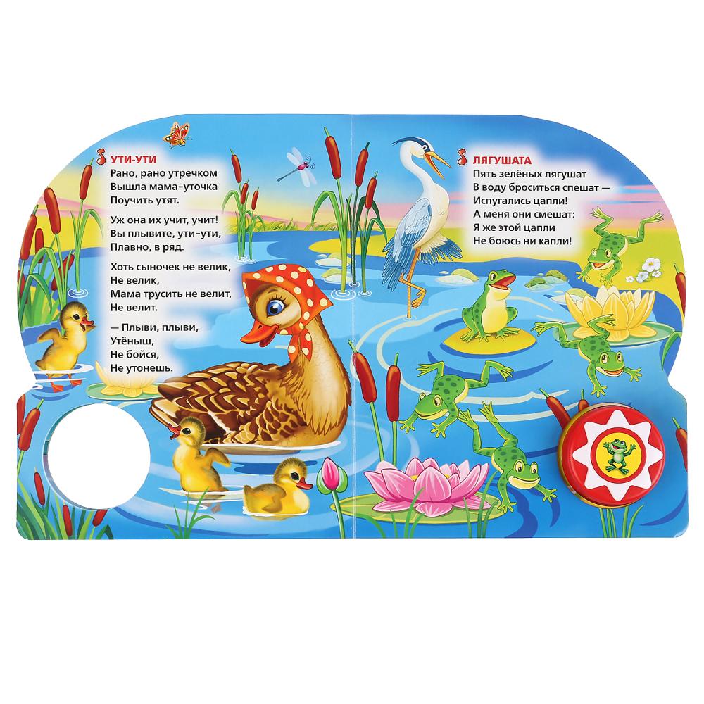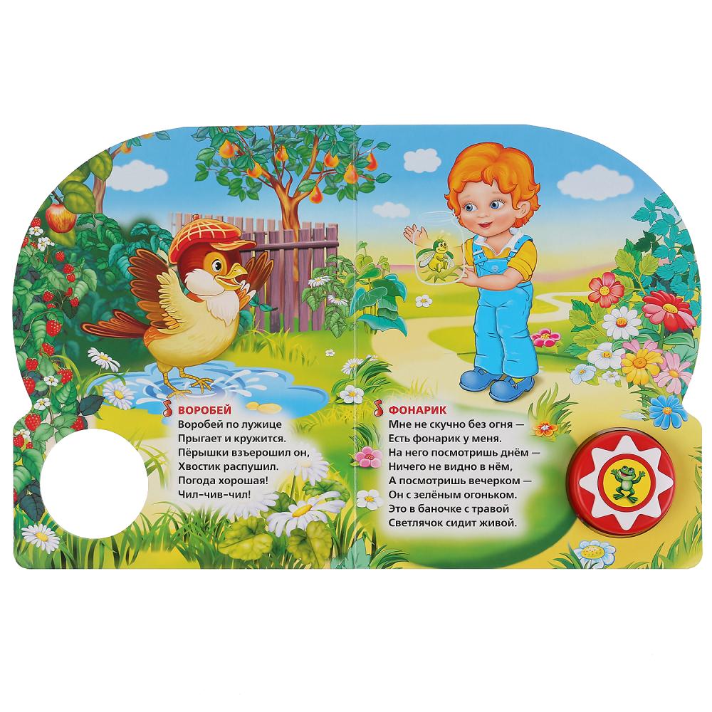 Ребенок с удовольствием будет листать плотные страницы с яркими картинками, нажимать на кнопку с рисунком и слушать музыкальные стихи. Благодаря компактному формату книгу удобно взять с собой в дорогу.