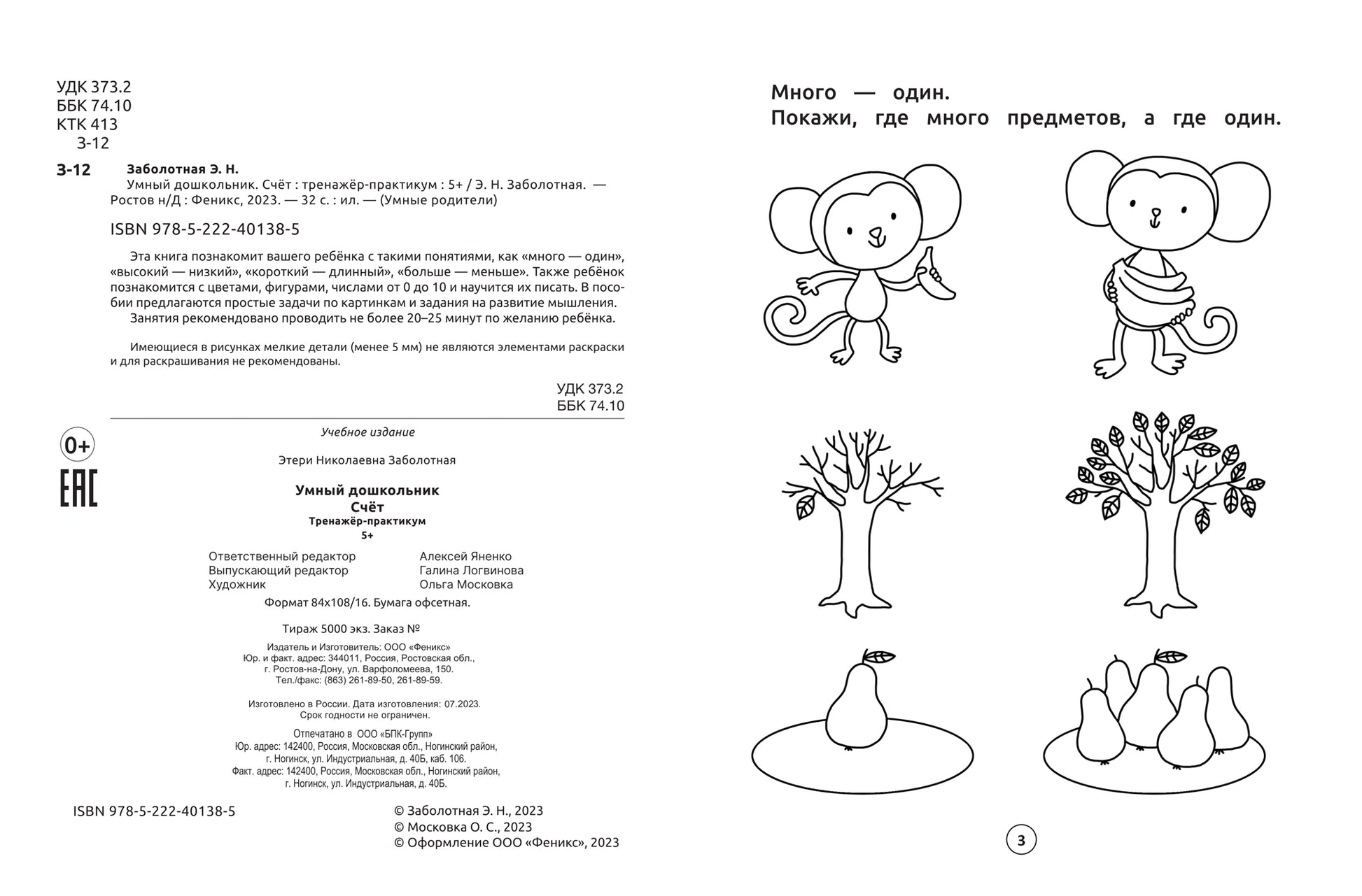 Умный дошкольник. Счет: тренажер-практикум: 5+ Эта книга познакомит вашего ребёнка с такими понятиями, как "много - один", "высокий - низкий", "короткий - длинный", "больше - меньше". Также ребёнок познакомится с цветами, фигурами, числами от 0 до 10 и научится их писать. В пособии предлагаются простые задачи по картинкам и задания на развитие мышления. Занятия рекомендовано проводить не более 20-25 минут по желанию ребёнка.