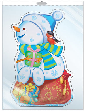 *ФМ-12064 ПЛАКАТ ВЫРУБНОЙ А4 В ПАКЕТЕ. Снеговичок на мешке с подарками (в индивидивидуальной упаковке с европодвесом и клеевым клапаном)