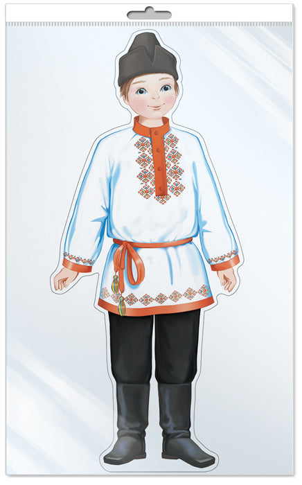 *Ф-14038 ПЛАКАТ ВЫРУБНОЙ А3 В ПАКЕТЕ Мальчик в чувашском костюме (блёстки в лаке) Плакат познакомит детей с традиционными костюмами народов России. Костюмы каждого народа отличались большим разнообразием, менялись от губернии к губернии, их детали различались, поэтому на наших карточках представлены обобщенные варианты костюмов.
