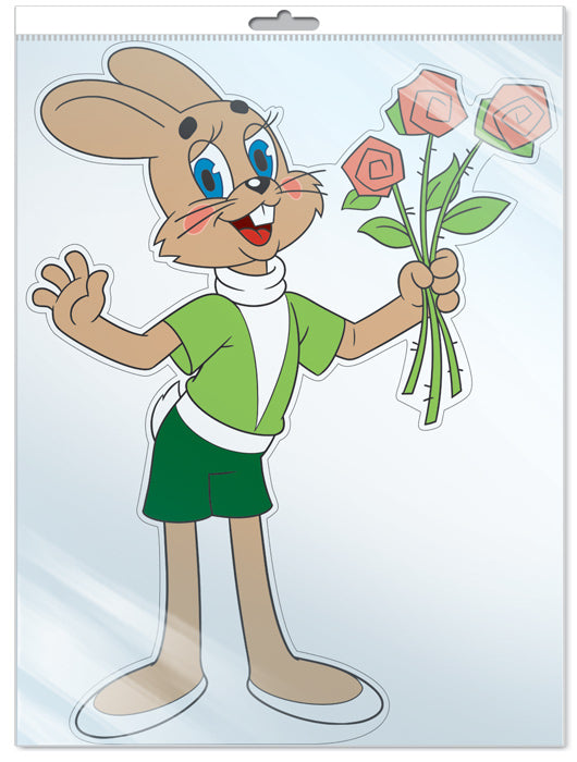 *Ф2-13137 ПЛАКАТ ВЫРУБНОЙ А3 В ПАКЕТЕ. Заяц с цветами из мультфильма Ну, погоди! (С блестками в индивидивидуальной упаковке с европодвесом и клеевым клапаном)