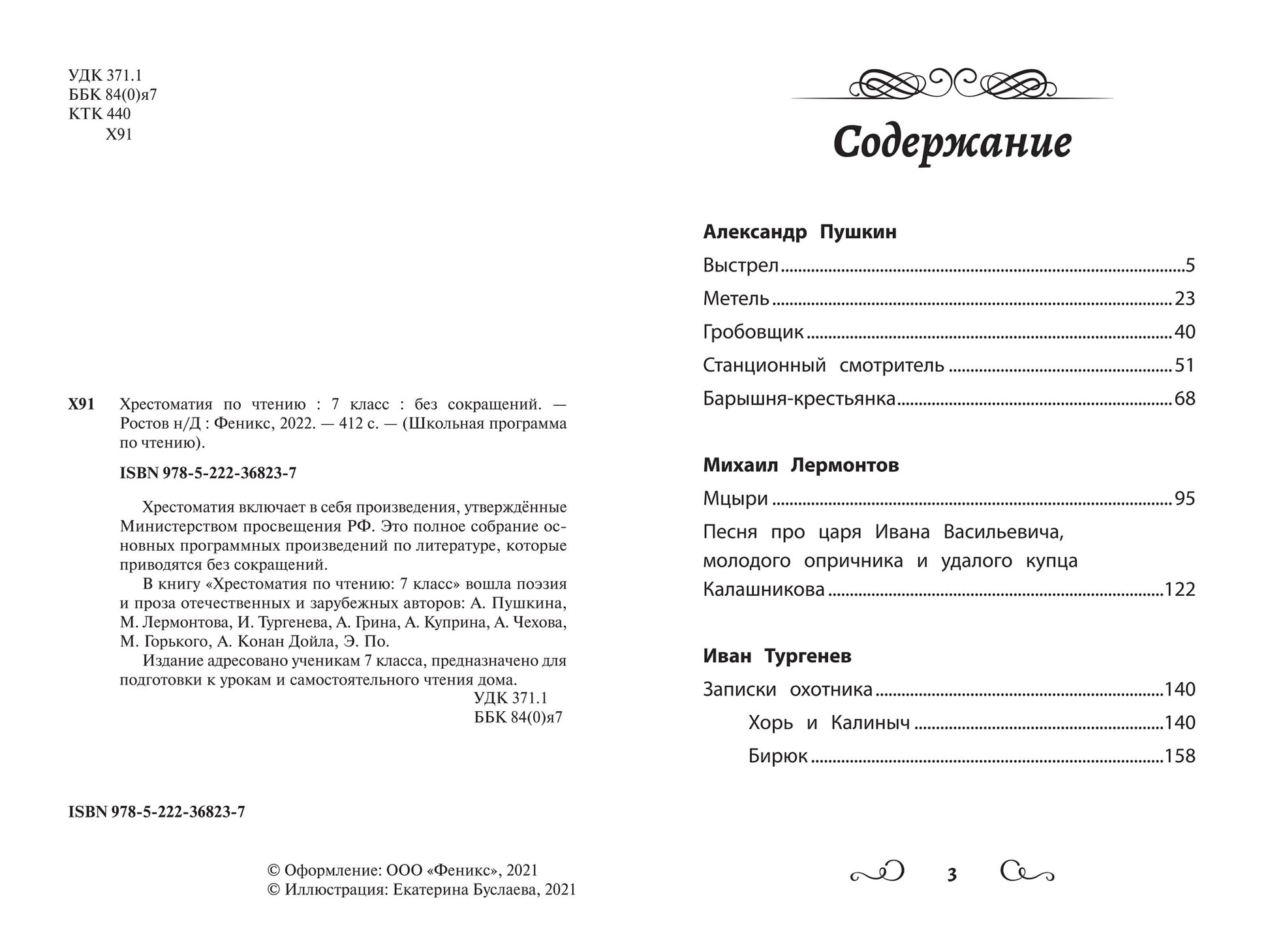 В книгу "Хрестоматия по чтению: 7 класс" вошла поэзия и проза отечественных и зарубежных авторов: А. Пушкина, М. Лермонтова, И. Тургенева, А. Грина, А. Куприна, А. Чехова, М. Горького, А. Конан Дойла, Э. По.