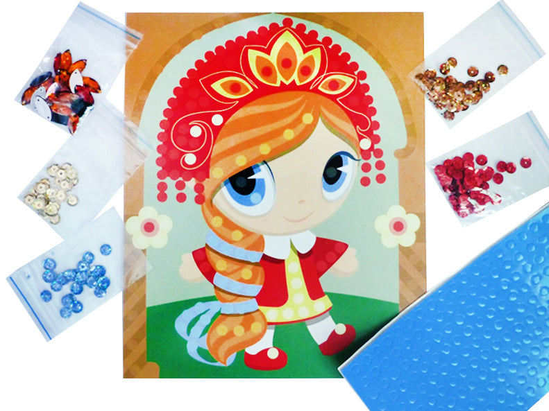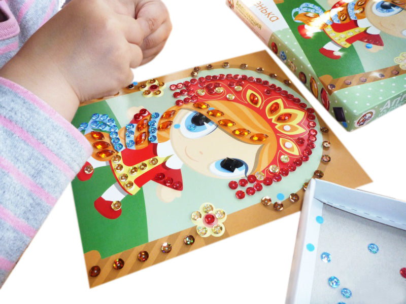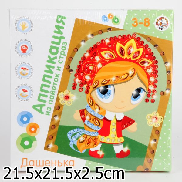 Handling time: 24 days Аппликация из пайеток и страз «Дашенька», набор для творчества. Состав набора: цветная картинка-основа из картона – 1 шт. (16,7 х 20,5 см), двусторонние самоклеящиеся детали из вспененного полимерного материала – 1 комплект, пайетки – 4 цветов: золотого, красного, коричневого, голубого (диаметр 7 мм.)стразы – 3 цветов: красного, золотого, чёрного (1 х 1 см.).Набор предназначен для детей от 3 лет. Материал:картон, полимерный материал. ппликация из пайеток и страз «Дашенька» развивает творческие способности ребёнка, внимание, усидчивость и мелкую моторику.