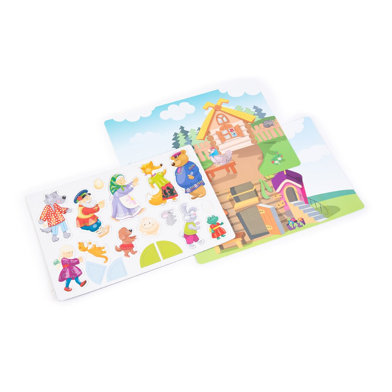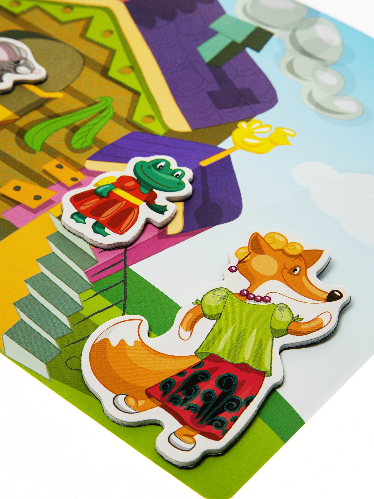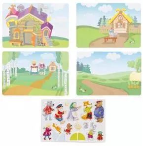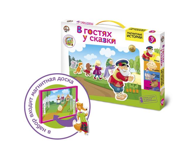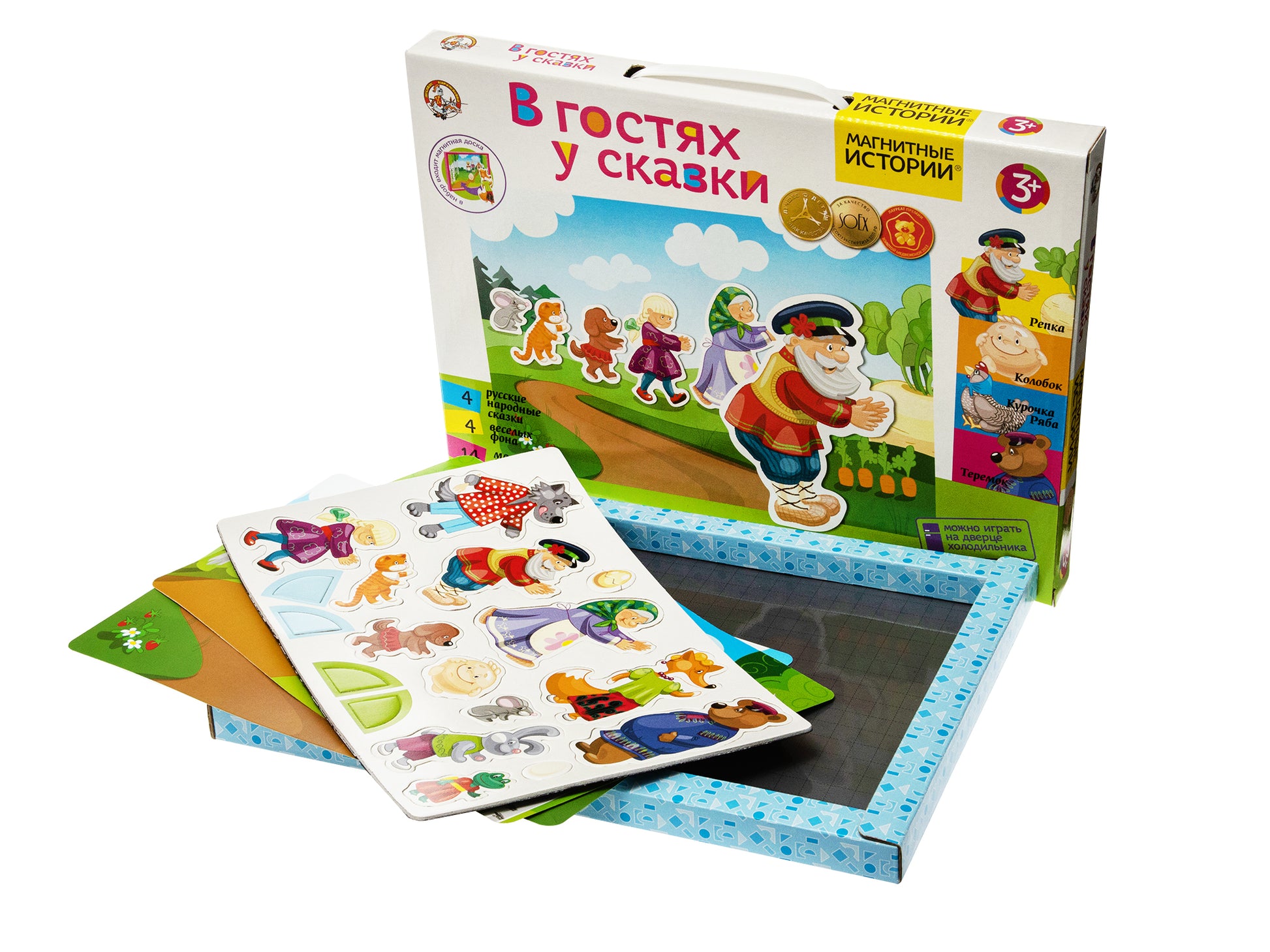 Игровой комплект состоит: из игрового поля, способного удерживать магнитные элементы этой игры как, впрочем, и другие, которые, вполне возможно, найдутся в игровой корзине Вашего ребенка, четырех игровых полей с напечатанными на них сюжетами, на фоне которых и будут происходить события сказки, превращаясь в игровую реальность, магнитных фигурок героев всех четырех сказок, вошедших в этот игровой сборник.