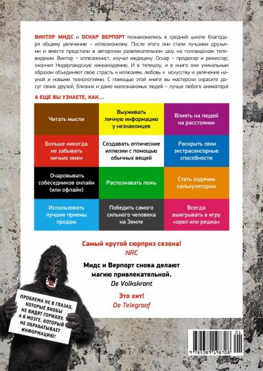 Handling time: 21 days Виктор Мидс и Оскар Верпорт впервые раскрывают секреты своего захватывающего и суперпопулярного телешоу, которое они ведут на голландском телевидении. Используя знания о природе иллюзий, данные психологии и медицины (и, разумеется, ловкость рук), они предлагают уникальный взгляд на то, как работает человеческий мозг. С помощью 101 иллюзии и эксперимента вы сами убедитесь, с какой легкостью вас могут обмануть собственный разум и чувства. Вы узнаете, как у вас получается «поричттаь, нпаиремр, ткаой ткест». И конечно же научитесь выполнять самые умопомрачительные трюки для своих зрителей!«Мы надеемся, что эта книга приоткроет завесу над природой иллюзии. Ведь органы чувств и мозг человека не воспринимают абсолютно объективную картину действительности — ее формируют и на нее влияют наше восприятие, предположения и воспоминания. Для нас нет ничего прекраснее, чем вдохновлять читателей пройти свой собственный путь фокусника и мага. Проверив все на себе, мы с удовольствием передаем вам свою волшебную эстафетную палочку. Наслаждайтесь силой иллюзий!» (Виктор Мидс, Оскар Верпорт)