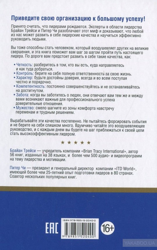 Принято считать, что лидерами рождаются. Эксперты в области лидерства Брайан Трейси и Питер Чи разоблачают этот миф и доказывают, что любой из нас может развить в себе лидерские качества и научиться эффективно руководить людьми. Вы тоже способны стать человеком, который воодушевляет других на великие свершения, и эта книга поможет вам шаг за шагом пройти путь настоящего лидера. Вдумчиво читайте это воодушевляющее руководство, и с каждым днем вы будете на шаг приближаться к своей цели стать высокоэффективным лидером.