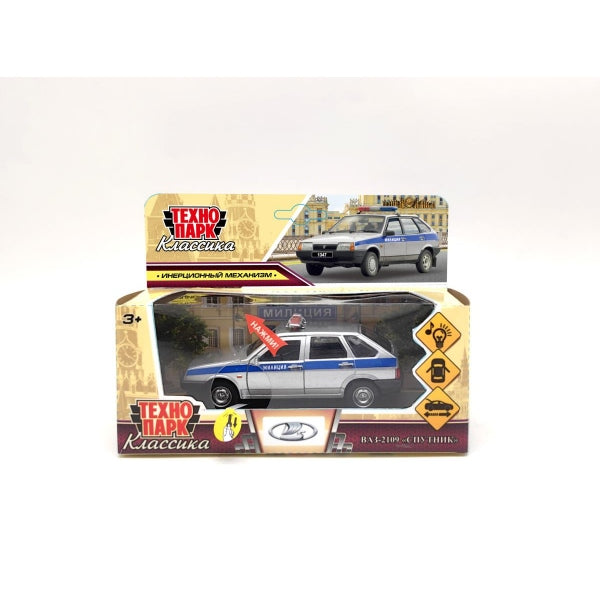 2109-12SLPOL-GY Машина металл свет-звук ваз-2109"спутник"12см,дв,баг,инер,МИЛИЦИЯ сереб,кор. Технопа