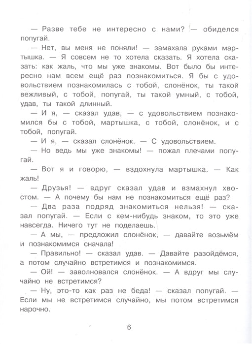 Главная задача героини этой сказки мартышки - не давать задумываться склонным к философии друзьям - удаву, слонёнку и попугаю. Если бы она их не тормошила с утра до вечера, жизнь в Африке показалась бы им не такой интересной. И у попугая есть своя задача - он постоянно ставит перед своей компанией неразрешимые задачи. А потом все вместе, мартышка, удав, слонёнок и попугай, их решают. Получается весёлая игра "в проблемы".Для дошкольного возраста. Пять причин купить 1Культовый цикл веселых историй о четверке друзей-животных. 2Книга легла в основу мультфильма, лауреата ряда международных наград. 3Неподражаемый слог и ирония Григория Остера. 4Книга, которую перечитывают и взрослые, и дети. 5Обаятельнейшие и забавные персонажи, за приключениями которых так интересно следить.