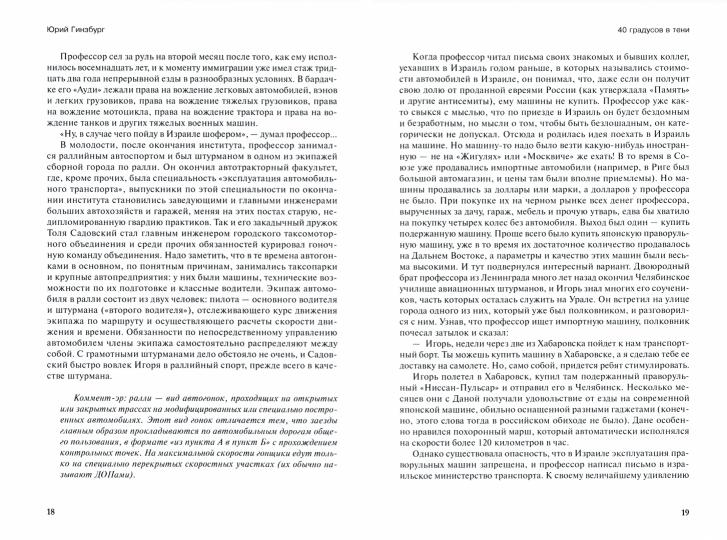 "40 градусов в тени" - автобиографический роман Юрия Гинзбурга. На пике своей карьеры герой, 50-летний доктор технических наук, профессор, специалист в области автомобилей и других самоходных машин, в начале 90-х переезжает из Челябинска в Израиль - своим ходом, на старенькой "Ауди-80", в сопровождении 16-летнего сына и чистопородного добермана.После многочисленных приключений в дороге он добирается до Земли обетованной, где и испытывает на себе все "прелести" эмиграции высококвалифицированного интеллигентного человека с неподходящей для страны ассимиляции специальностью. Не желая, подобно многим своим собратьям, мириться с тотальной пролетаризацией советских эмигрантов, он открывает в Израиле ряд проектов; встречается со множеством людей; работает во многих странах Америки, Европы, Азии и Африки - и об этом ему тоже есть что рассказать! Обо всем этом: о жизни и карьере в СССР, о процессе эмиграции, об истинном лице Израиля, отлакированном в книгах отказников, о трансформации..."40 градусов в тени" - автобиографический роман Юрия Гинзбурга. На пике своей карьеры герой, 50-летний доктор технических наук, профессор, специалист в области автомобилей и других самоходных машин, в начале 90-х переезжает из Челябинска в Израиль - своим ходом, на старенькой "Ауди-80", в сопровождении 16-летнего сына и чистопородного добермана.После многочисленных приключений в дороге он добирается до Земли обетованной, где и испытывает на себе все "прелести" эмиграции высококвалифицированного интеллигентного человека с неподходящей для страны ассимиляции специальностью. Не желая, подобно многим своим собратьям, мириться с тотальной пролетаризацией советских эмигрантов, он открывает в Израиле ряд проектов; встречается со множеством людей; работает во многих странах Америки, Европы, Азии и Африки - и об этом ему тоже есть что рассказать! Обо всем этом: о жизни и карьере в СССР, о процессе эмиграции, об истинном лице Израиля, отлакированном в книгах отказников, о трансформации идеалов в реальность, о синдроме эмигранта, об особенностях работы в разных странах, о нестандартном и спорном выходе, который в конце концов находит герой романа, - и рассказывает автор в своей книге.