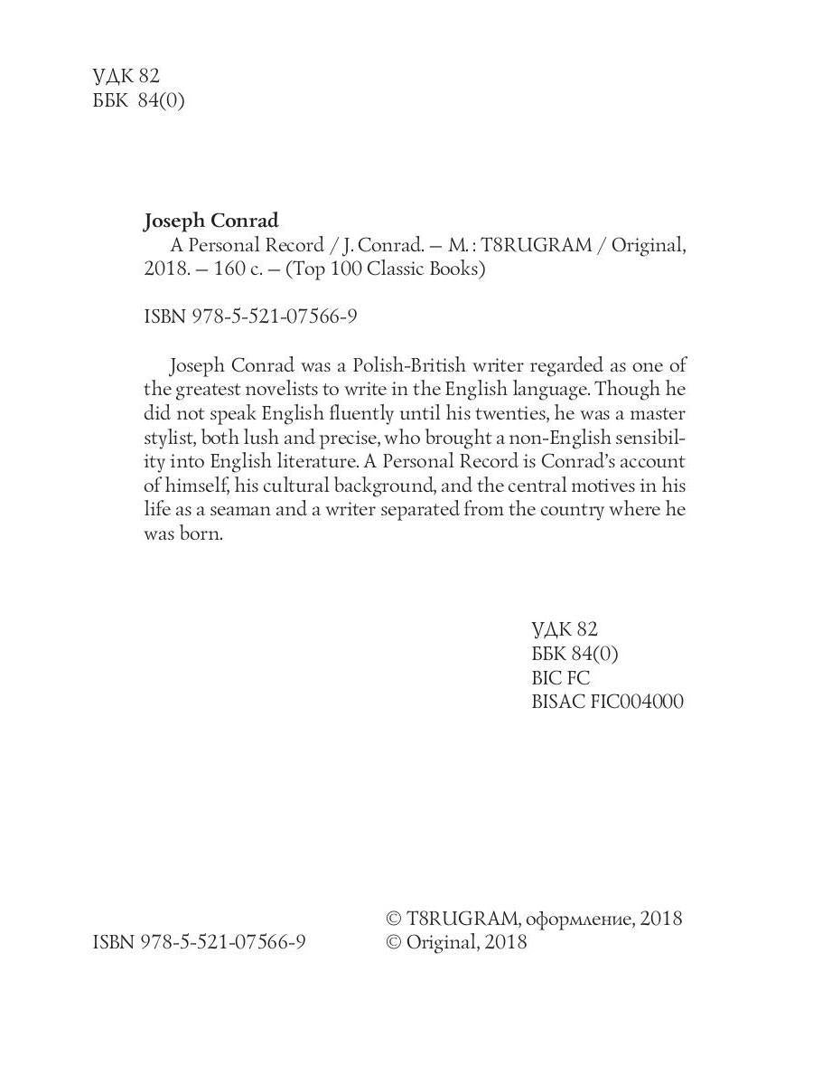 Автор: Conrad J., «A Personal Record. Мемуары: на англ.яз»: Joseph Conrad was a Polish-British writer regarded as one of the greatest novelists to write in the English language. Though he did not speak English fluently until his twenties, he was a master stylist, both lush and precise, who brought a non-English sensibility into English literature. A Personal Record is Conrad's account of himself, his cultural background, and the central motives in his life as a seaman and a writer separated from the country where he was born.