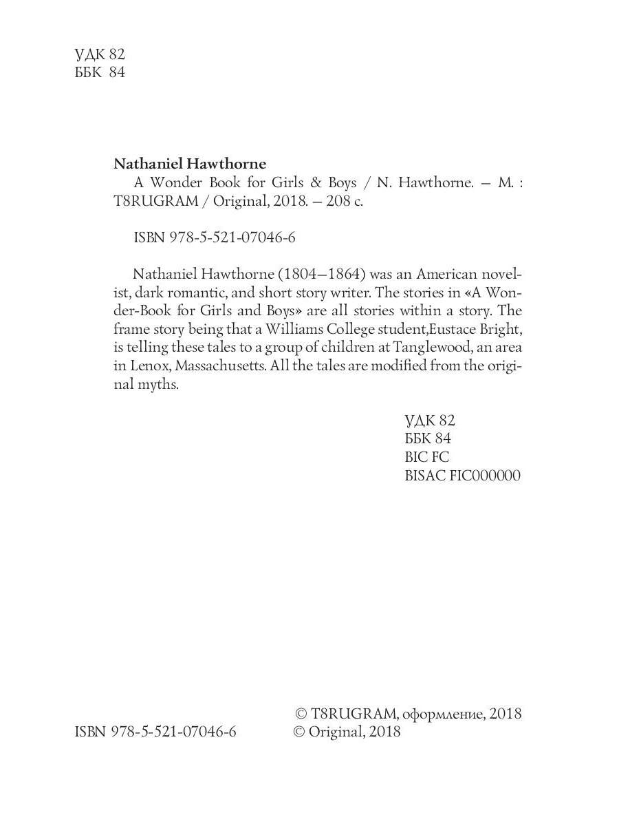 Handling time: 25 days Автор: Hawthorne N., «A Wonder Book for Girls & Boys = Книга чудес для девочек и мальчиков: кн. на англ.яз»: Nathaniel Hawthorne (1804—1864) was an American novelist, dark romantic, and short story writer. The stories in «A Wonder-Book for Girls and Boys» are all stories within a story. The frame story being that a Williams College student,Eustace Bright, is telling these tales to a group of children at Tanglewood, an area in Lenox, Massachusetts. All the tales are modified from the original myths.