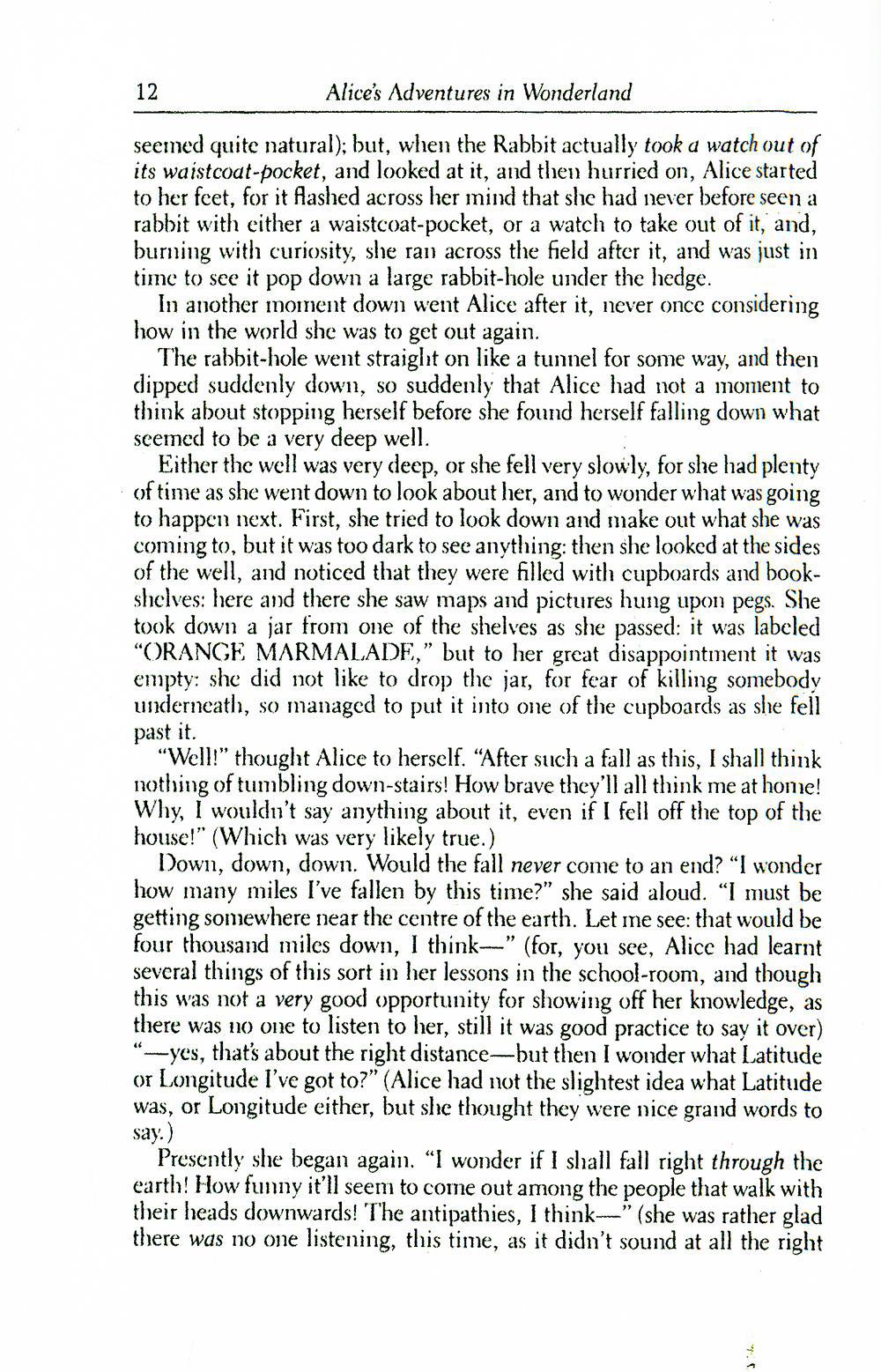 Handling time: 21 days Автор: Carroll L., «Alice's Adventures in Wonderland»: Alice’s Adventures in Wonderland, first published in 1865, tells of a girl named Alice falling through a rabbit hole into a fantasy world populated by peculiar anthropomorphic creatures. The tale plays with logic, giving the story lasting popularity with adults as well as with children. Its narrative course and structure, characters and imagery have been enormously influential in both popular culture and literature, especially in the fantasy genre.