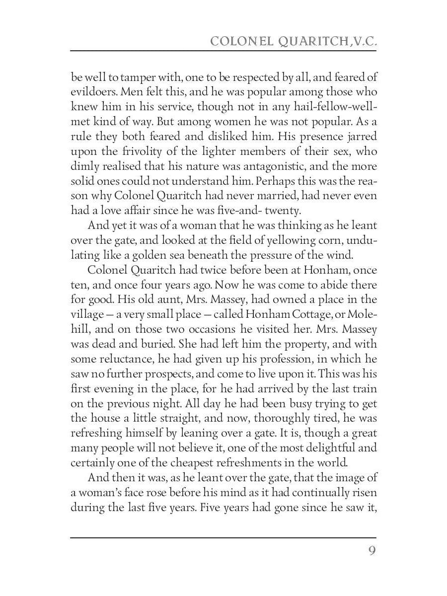 Автор: Haggard H.R., «Colonel Quaritch,V.C. = Полковник Куарич, В.К.: роман на англ.яз»: Colonel Quaritch is an impoverished nobleman, who is looking for the family jewels of his bride — the "treasure de la Moley". He moves to the house of his late aunt in the village of Honhem and soon becomes involved in an adventure.