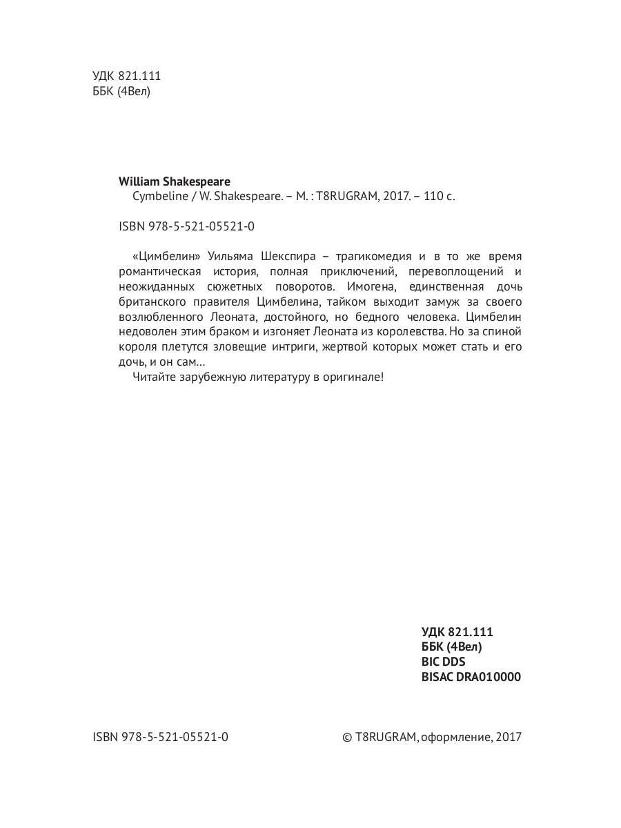 Автор: Shakespeare W., «Cymbeline = Цимбелин: трагикомедия на англ.яз»: «Цимбелин» Уильяма Шекспира - трагикомедия и в то же время романтическая история, полная приключений, перевоплощений и неожиданных сюжетных поворотов. Имогена, единственная дочь британского правителя Цимбелина, тайком выходит замуж за своего возлюбленного Леоната, достойного, но бедного человека. Цимбелин недоволен этим браком и изгоняет Леоната из королевства. Но за спиной короля плетутся зловещие интриги, жертвой которых может стать и его дочь, и он сам... Читайте зарубежную литературу в оригинале!