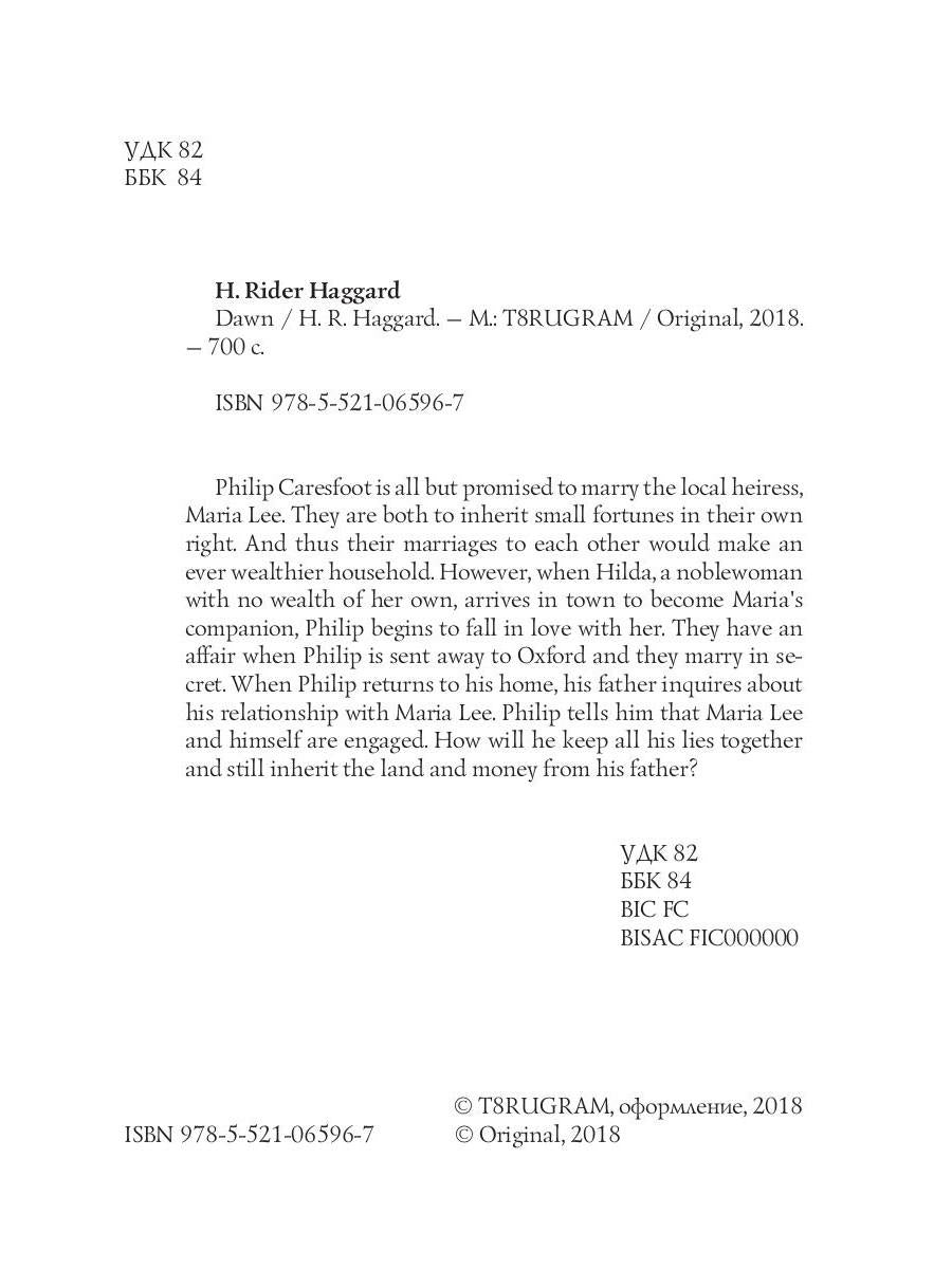 Автор: Haggard Henry Rider, «Dawn. Рассвет (на английском языке)»: Philip Caresfoot is all but promised to marry the local heiress, Maria Lee. They are both to inherit small fortunes in their own right. And thus their marriages to each other would make an ever wealthier household. However, when Hilda, a noblewoman with no wealth of her own, arrives in town to become Maria's companion, Philip begins to fall in love with her. They have an affair when Philip is sent away to Oxford and they marry in secret. When Philip returns to his home, his father inquires about his relationship with Maria Lee. Philip tells him that Maria Lee and himself are engaged. How will he keep all his lies together and still inherit the land and money from his father?