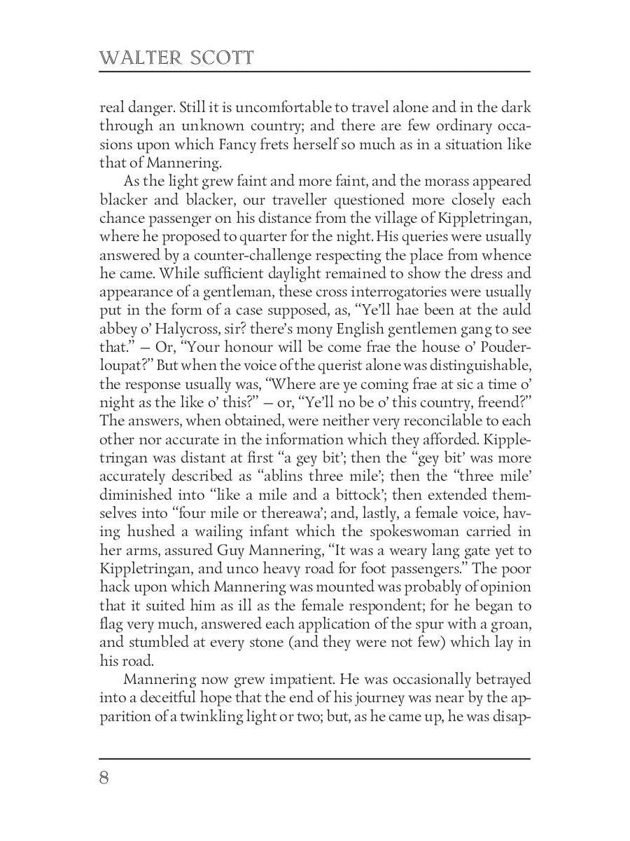 Автор: Scott W., «Guy Mannering = Гай Мэннеринг: на англ.яз»: Walter Scott (1771—1832) was a Scottish historical novelist, poet, and playwright. Although he was an advocate and legal administrator by profession, Scott is most famous for his great literary works and activities in the Royal Highland Society. Being one of the most popular historical novels of the time, "Guy Mannering" tells the story a young boy Henry Bertram, who was kidnapped at the age of five by smugglers after witnessing the murder of a customs officer. It follows the adventures of Harry and the fate of his family in later years, as well as the struggle around the inheritance of his estate. The novel also describes the lawlessness of that time, full of smugglers, thieves, and killers.