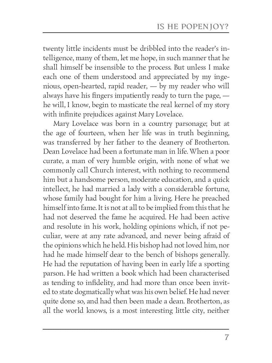 Handling time: 25 days Автор: Trollope A., «Is He Popenjoy? 1»: Anthony Trollope (1815 — 1882) was an English novelist of the Victorian era. Among his best-known works is a series of novels collectively known as the Chronicles of Barsetshire, which revolves around the imaginary county of Barsetshire. "Is He Popenjoy?" is a comic novel, which tells a story of the Marquis of Brotherton who returns to England from Italy with an Italian wife and small child who he claims as his heir, Lord Popenjoy. The plot explores, among other things the question of legitimacy and also that of the power struggles between husband and wife — a topic frequently visited by Trollope.