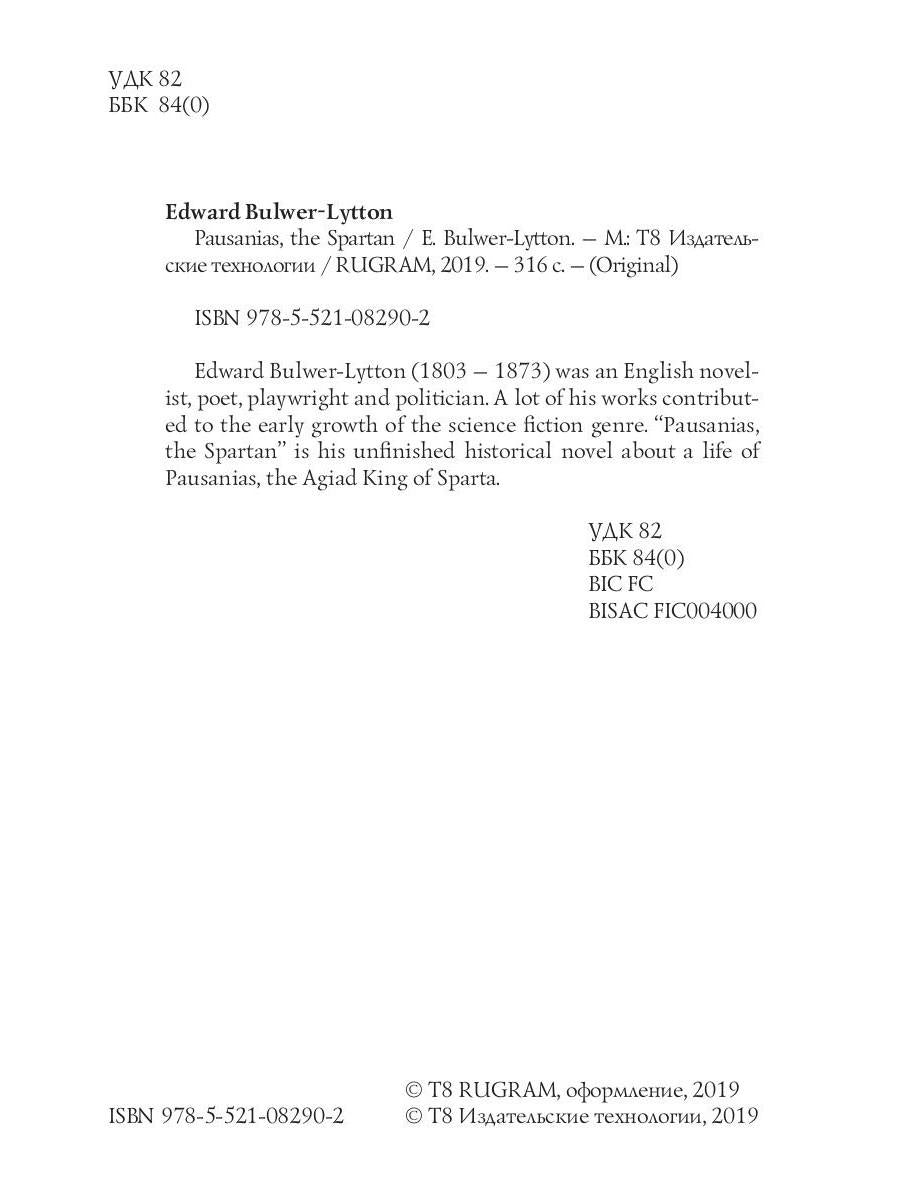 Handling time: 25 days Автор: Bulwer-Lytton E., «Pausanias, the Spartan = Павсаний, спартанец»: Edward Bulwer-Lytton (1803 — 1873) was an English novelist, poet, playwright and politician. A lot of his works contributed to the early growth of the science fiction genre. "Pausanias, the Spartan" is his unfinished historical novel about a life of Pausanias, the Agiad King of Sparta.