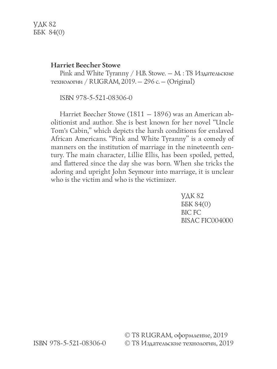 Handling time: 25 days Автор: Stowe H., «Pink and White Tyranny = Бело-розовая тирания: на англ.яз»: Harriet Beecher Stowe (1811 — 1896) was an American abolitionist and author. She is best known for her novel "Uncle Tom's Cabin," which depicts the harsh conditions for enslaved African Americans. "Pink and White Tyranny" is a comedy of manners on the institution of marriage in the nineteenth century. The main character, Lillie Ellis, has been spoiled, petted, and flattered since the day she was born. When she tricks the adoring and upright John Seymour into marriage, it is unclear who is the victim and who is the victimizer.