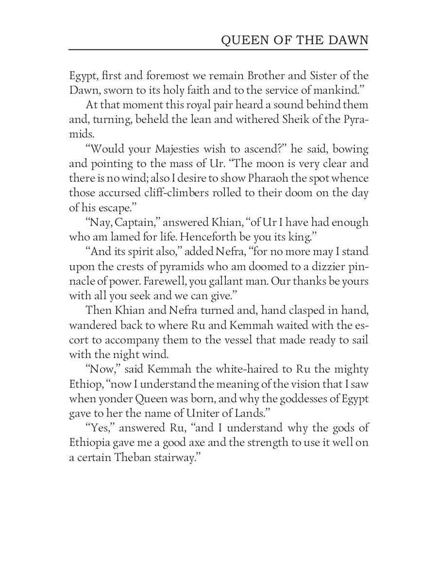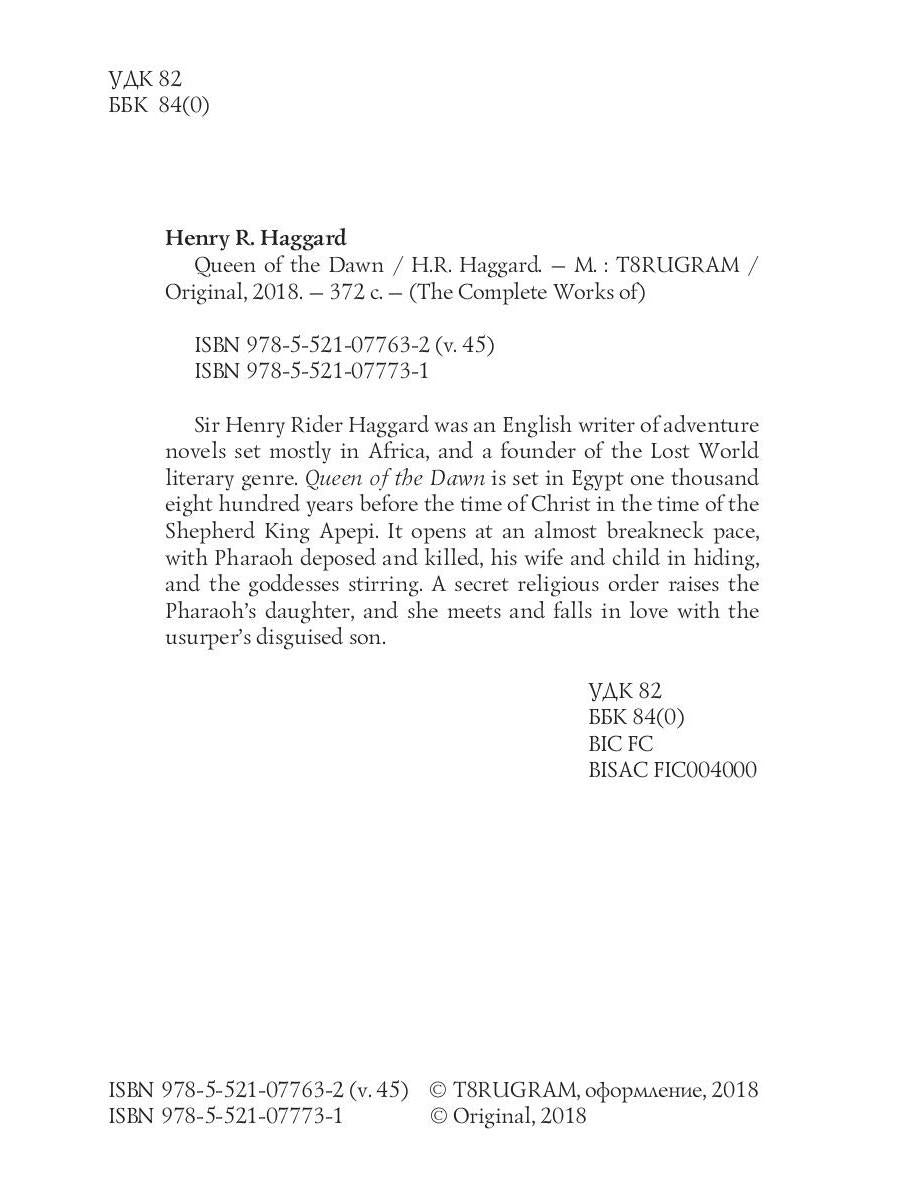 Handling time: 25 days Автор: Haggard H.R., «Queen of the Dawn = Владычица Зари: на англ.яз»: Sir Henry Rider Haggard was an English writer of adventure novels set mostly in Africa, and a founder of the Lost World literary genre. Queen of the Dawn is set in Egypt one thousand eight hundred years before the time of Christ in the time of the Shepherd King Apepi. It opens at an almost breakneck pace, with Pharaoh deposed and killed, his wife and child in hiding, and the goddesses stirring. A secret religious order raises the Pharaoh's daughter, and she meets and falls in love with the usurper's disguised son.