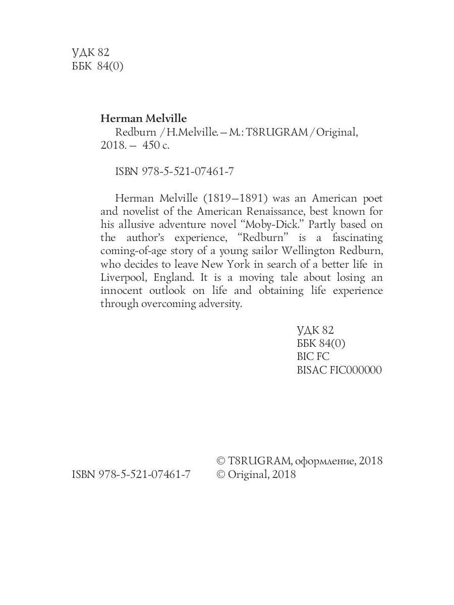 Handling time: 25 days Автор: Melville H., «Redburn = Редберн: на англ.яз»: Herman Melville (1819-1891) was an American poet and novelist of the American Renaissance, best known for his allusive adventure novel "Moby-Dick." Partly based on the author's experience, "Redburn" is a fascinating coming- of-age story of a young sailor Wellington Redburn, who decides to leave New York in search of a better life in Liverpool, England. It is a moving tale about losing an innocent outlook on life and obtaining life experience through overcoming adversity.