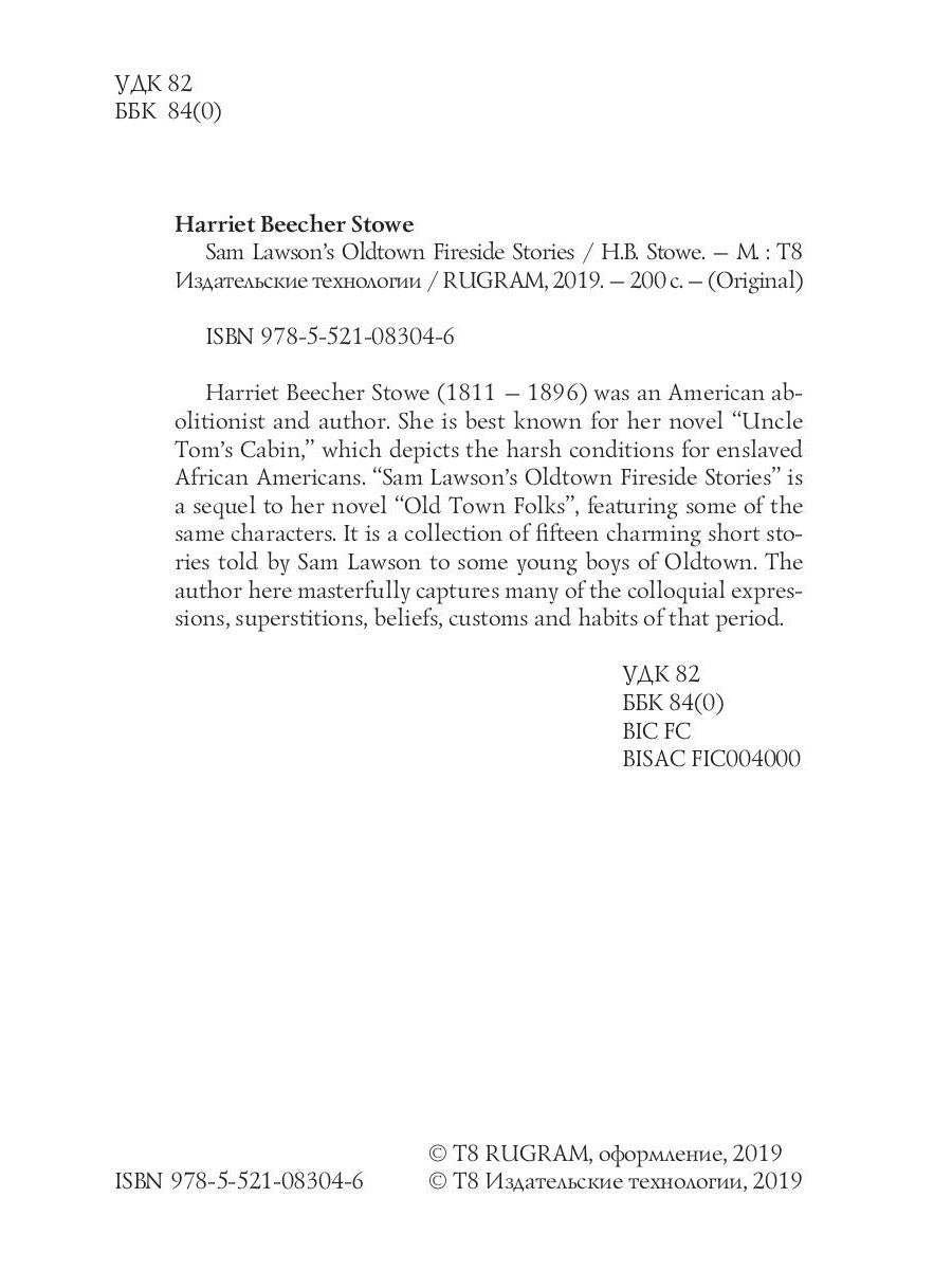 Handling time: 21 days Автор: Stowe H., «Sam Lawson's Oldtown Fireside Stories = Олдтаунские рассказы у камелька, поведанные Сэмом Лоусоном: на англ.яз»: Harriet Beecher Stowe (1811 — 1896) was an American abolitionist and author. She is best known for her novel "Uncle Tom's Cabin," which depicts the harsh conditions for enslaved African Americans. "Sam Lawson's Oldtown Fireside Stories" is a sequel to her novel "Old Town Folks", featuring some of the same characters. It is a collection of fifteen charming short stories told by Sam Lawson to some young boys of Oldtown. The author here masterfully captures many of the colloquial expressions, superstitions, beliefs, customs and habits of that period.