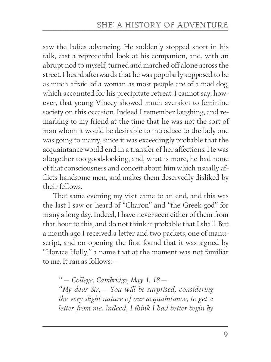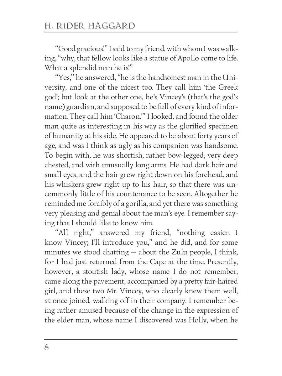 Автор: Haggard H.R., «She: A History of Adventure = Она: история приключения: на англ.яз»: She is the story of Cambridge professor Horace Holly and his ward Leo Vincey, and their journey to a lost kingdom in the African interior. The journey is triggered by a mysterious package left to Leo by his father, to be opened on his 25th birthday; the package contains an ancient shard of pottery and several documents, suggesting an ancient mystery about the Vincey family. Holly and Leo eventually arrive in eastern Africa where they encounter a primitive race of natives and a mysterious white queen, Ayesha, who reigns as the all-powerful "She" or "She-who-must-be-obeyed".