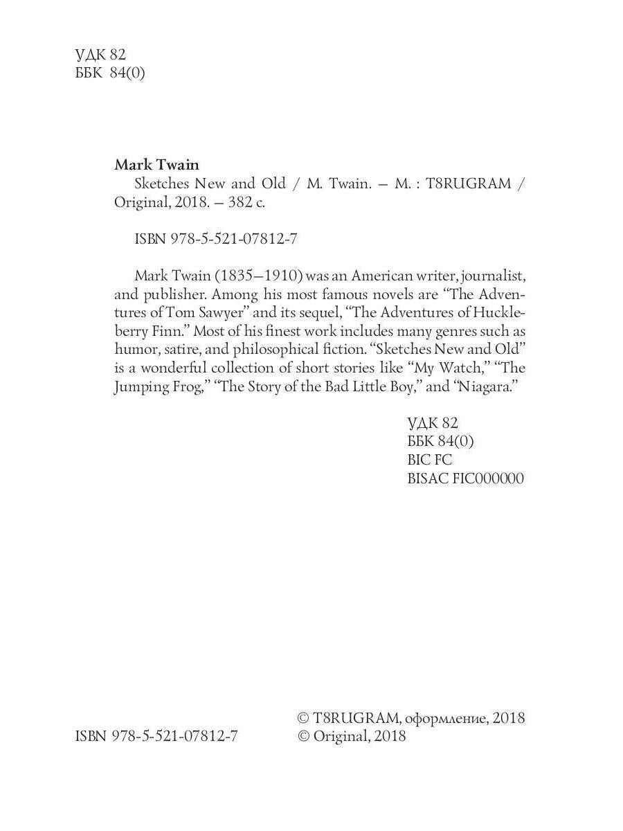 Автор: Twain M., «Sketches New and Old = Старые и новые очерки: на англ.яз»: Mark Twain (1835—1910) was an American writer, journalist, and publisher. Among his most famous novels are "The Adventures of Tom Sawyer" and its sequel, "The Adventures of Huckleberry Finn." Most of his finest work includes many genres such as humor, satire, and philosophical fiction. "Sketches New and Old" is a wonderful collection of short stories like "My Watch," "The Jumping Frog," "The Story of the Bad Little Boy," and "Niagara."