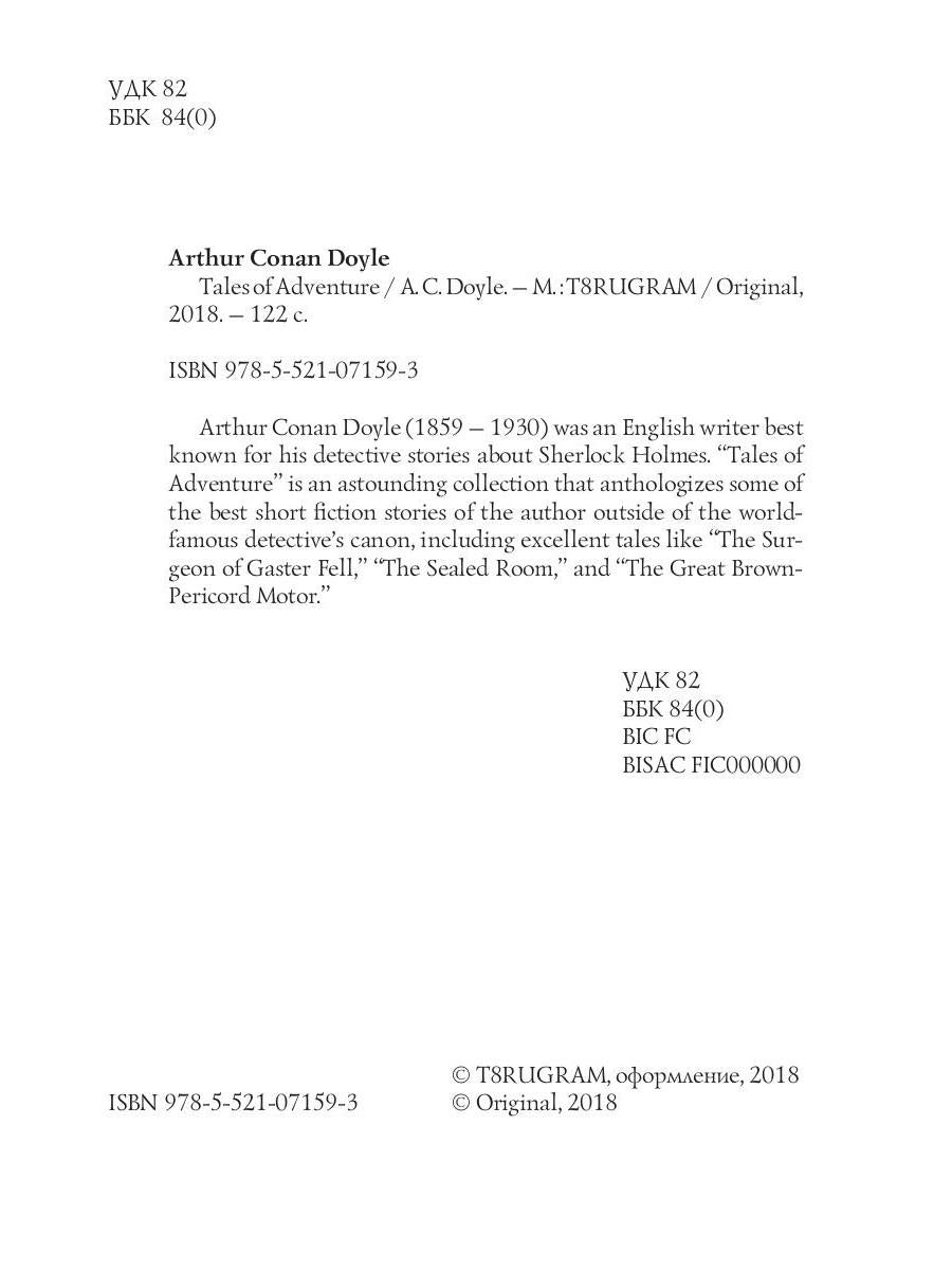 Автор: Doyle Arthur Conan, «Tales of Adventure = Рассказы о приключениях: на англ.яз»: Arthur Conan Doyle (1859 — 1930) was an English writer best known for his detective stories about Sherlock Holmes. "Tales of Adventure" is an astounding collection that anthologizes some of the best short fiction stories of the author outside of the world-famous detective's canon, including excellent tales like "The Surgeon of Gaster Fell," "The Sealed Room," and "The Great Brown-Pericord Motor."