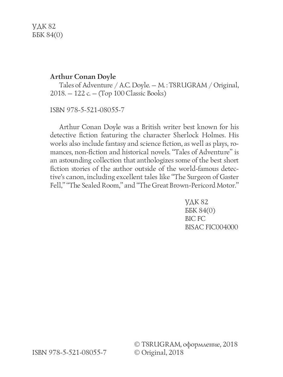 Handling time: 21 days Автор: Doyle Arthur Conan, «Tales of Adventure = Рассказы о приключениях: на англ.яз»: Arthur Conan Doyle was a British writer best known for his detective fiction featuring the character Sherlock Holmes. His works also include fantasy and science fiction, as well as plays, romances, non-fiction and historical novels. "Tales of Adventure" is an astounding collection that anthologizes some of the best short fiction stories of the author outside of the world-famous detective's canon, including excellent tales like "The Surgeon of Gaster Fell," "The Sealed Room," and "The Great Brown-Pericord Motor."