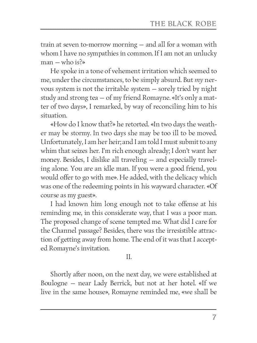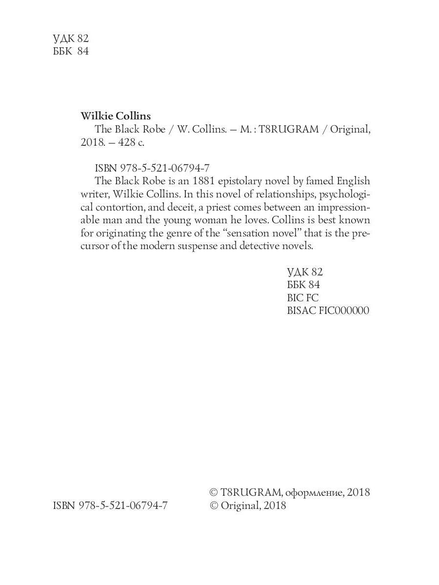 Автор: Collins William Wilkie, «The Black Robe = Человек в черном (на английском языке)»: The Black Robe is an 1881 epistolary novel by famed English writer, Willde Collins. In this novel of relationships, psychological contortion, and deceit, a priest comes between an impressionable man and the young woman he loves. Collins is best known for originating the genre of the "sensation novel" that is the precursor of the modern suspense and detective novels.