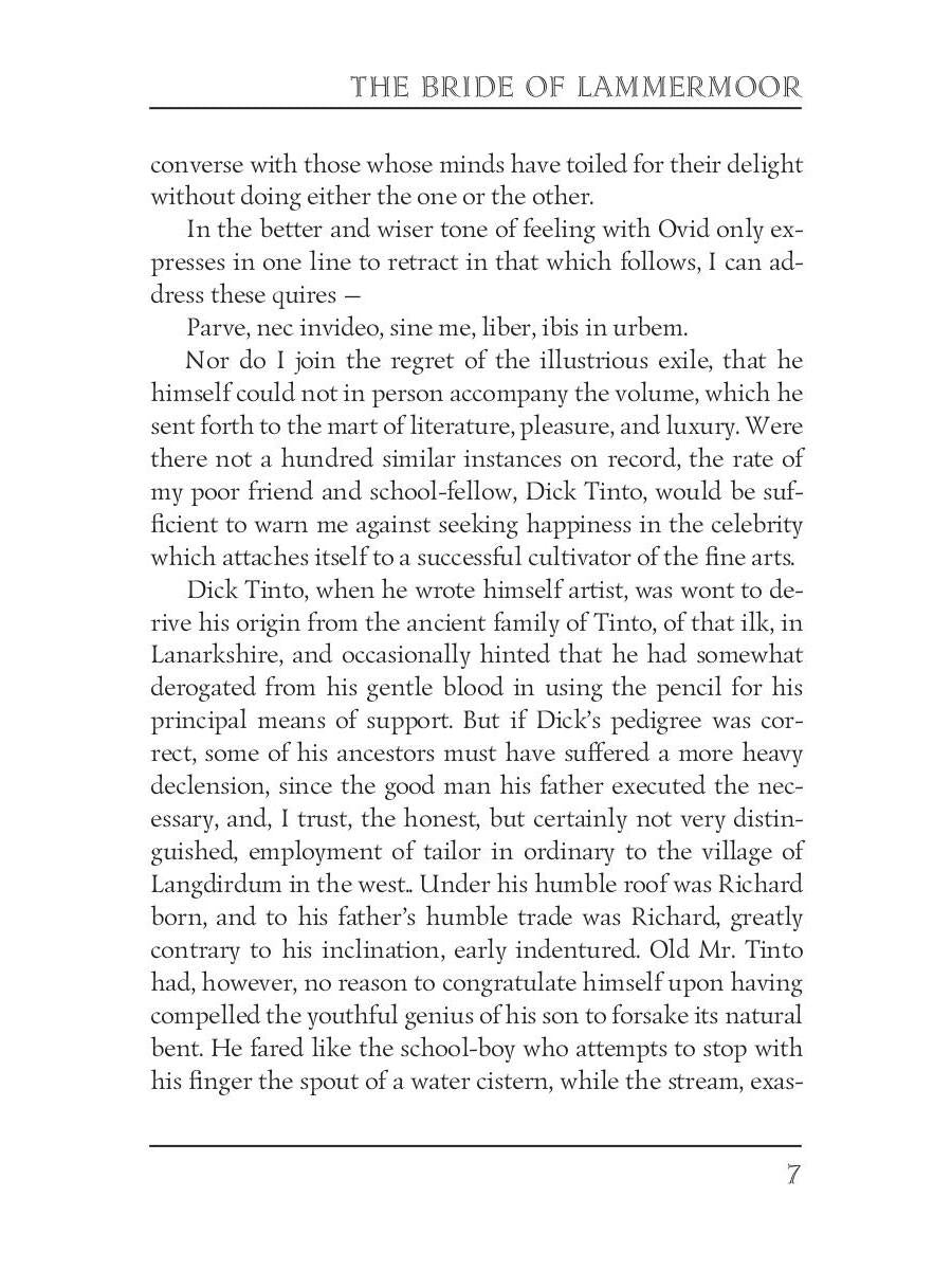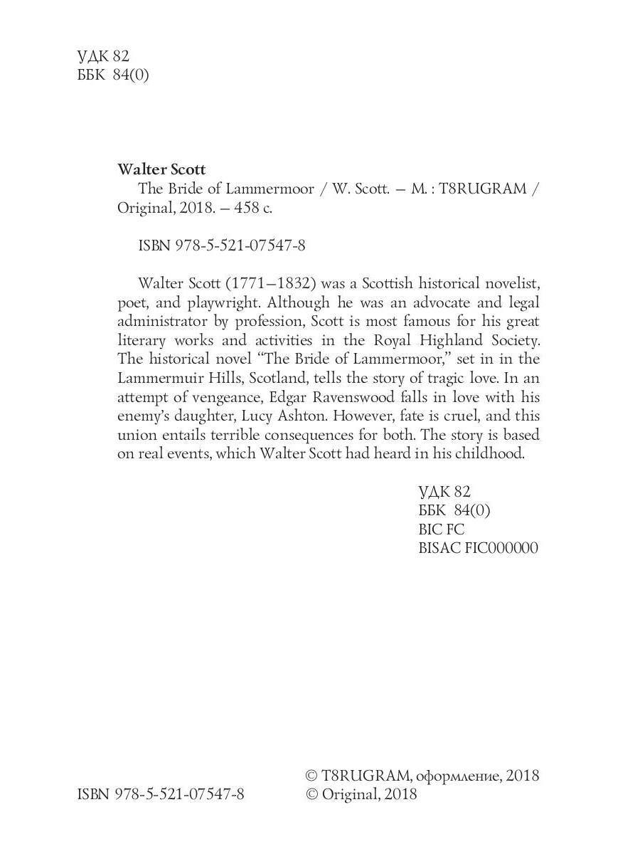 Автор: Scott W., «The Bride of Lammermoor = Ламмермурская невеста: на англ.яз»: Walter Scott (1771-1832) was a Scottish historical novelist, poet, and playwright. Although he was an advocate and legal administrator by profession, Scott is most famous for his great literary works and activities in the Royal Highland Society. The historical novel "The Bride of Lammermoor," set in in the Lammermuir Hills, Scotland, tells the story of tragic love. In an attempt of vengeance, Edgar Ravenswood falls in love with his enemy's daughter, Lucy Ashton. However, fate is cruel, and this union entails terrible consequences for both. The story is based on real events, which Walter Scott had heard in his childhood.
