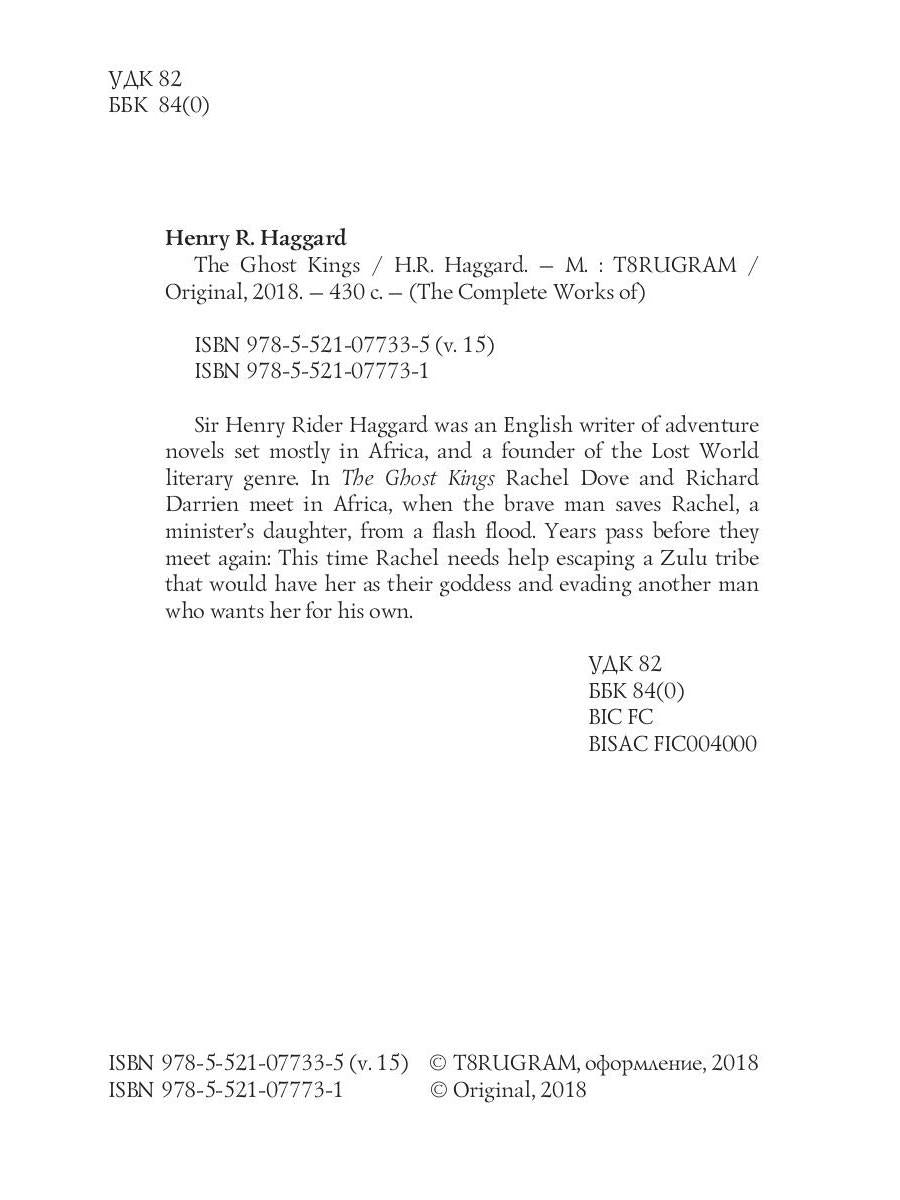 Handling time: 25 days Автор: Haggard H.R., «The Ghost Kings = Призрачные Короли: на англ.яз»: Sir Henry Rider Haggard was an English writer of adventure novels set mostly in Africa, and a founder of the Lost World literary genre. In The Ghost Kings Rachel Dove and Richard Darrien meet in Africa, when the brave man saves Rachel, a minister's daughter, from a flash flood. Years pass before they meet again: This time Rachel needs help escaping a Zulu tribe that would have her as their goddess and evading another man who wants her for his own.