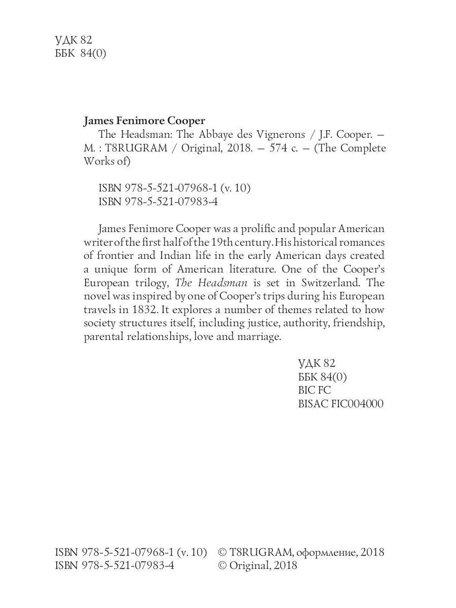 Handling time: 25 days Автор: Cooper J.F., «The Headsman: The Abbaye des Vignerons = Палач, или Аббатство виноградарей. Т. 10: на англ.яз»: James Fenimore Cooper was a prolific and popular American writer of the first half of the 19th century. His historical romances of frontier and Indian life in the early American days created a unique form of American literature. One of the Cooper's European trilogy, The Headsman is set in Switzerland. The novel was inspired by one of Cooper's trips during his European travels in 1832. It explores a number of themes related to how society structures itself, including justice, authority, friendship, parental relationships, love and marriage.