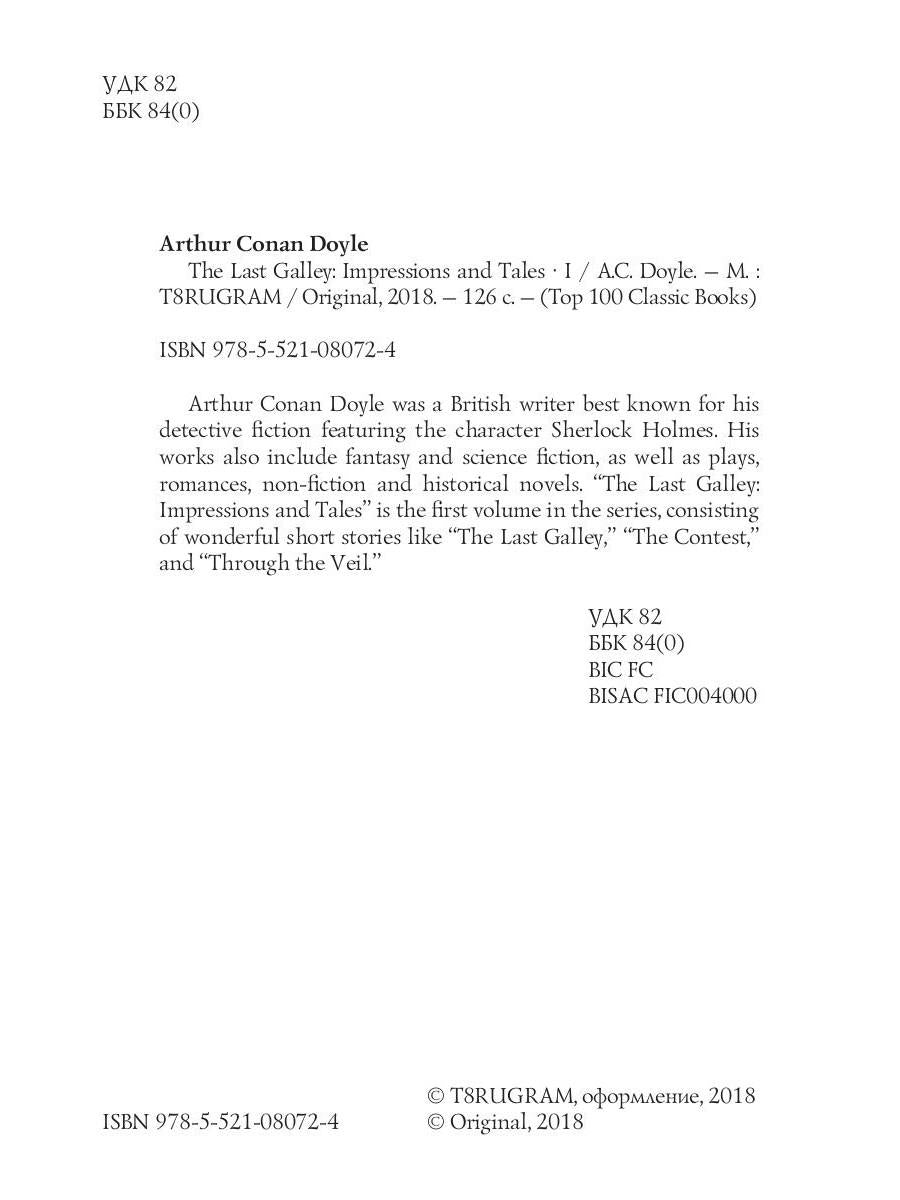 Автор: Doyle Arthur Conan, «The Last Galley: Impressions and Tales 1 = Последняя галерея: впечатления и рассказы 1: на англ.яз»: Arthur Conan Doyle was a British writer best known for his detective fiction featuring the character Sherlock Holmes. His works also include fantasy and science fiction, as well as plays, romances, non-fiction and historical novels. "The Last Galley: Impressions and Tales" is the first volume in the series, consisting of wonderful short stories like "The Last Galley," "The Contest," and "Through the Veil."