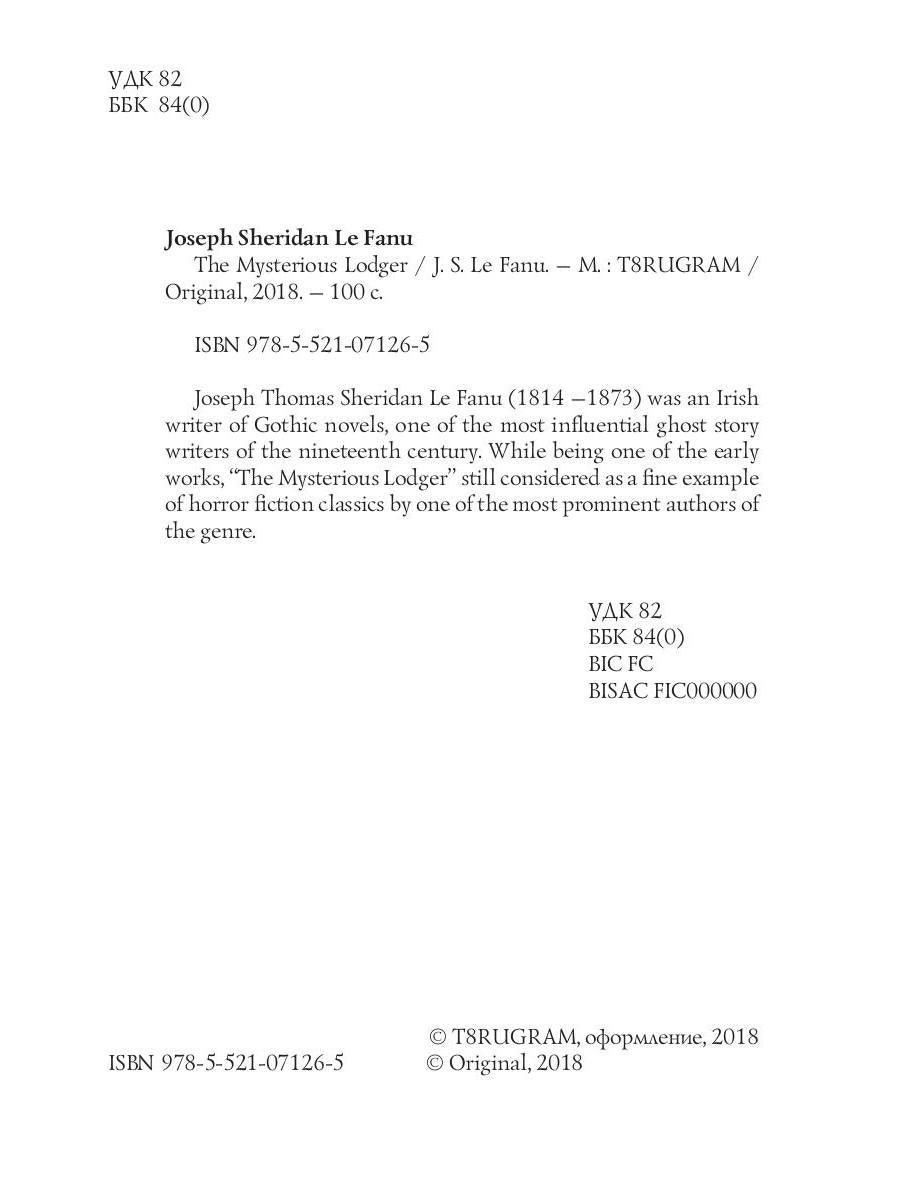 Handling time: 19 days Автор: Le Fanu J.S., «The Mysterious Lodger = Загадочный житель: на англ.яз»: Joseph Thomas Sheridan Le Fanu (1814 —1873) was an Irish writer of Gothic novels, one of the most influential ghost story writers of the nineteenth century. While being one of the early works, "The Mysterious Lodger" still considered as a fine example of horror fiction classics by one of the most prominent authors of the genre.
