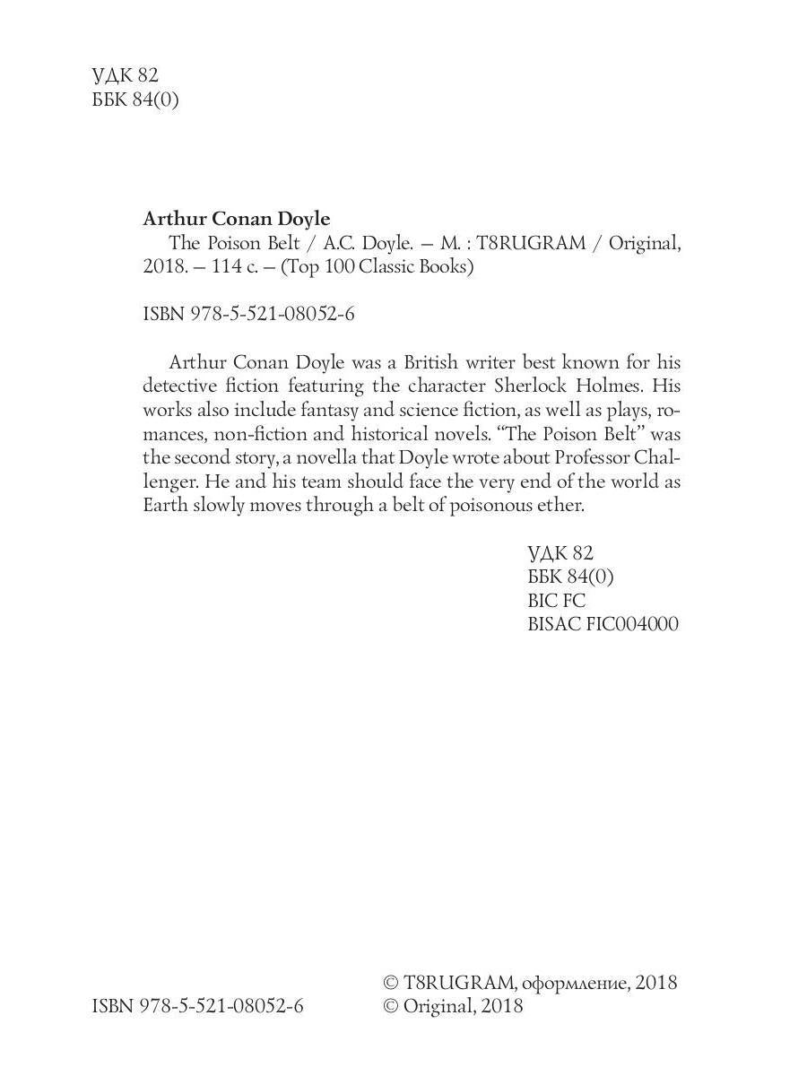 Автор: Doyle Arthur Conan, «The Poison Belt = Отравленный пояс: на англ.яз»: Arthur Conan Doyle was a British writer best known for his detective fiction featuring the character Sherlock Holmes. His works also include fantasy and science fiction, as well as plays, romances, non-fiction and historical novels. "The Poison Belt" was the second story, a novella that Doyle wrote about Professor Challenger. He and his team should face the very end of the world as Earth slowly moves through a belt of poisonous ether.