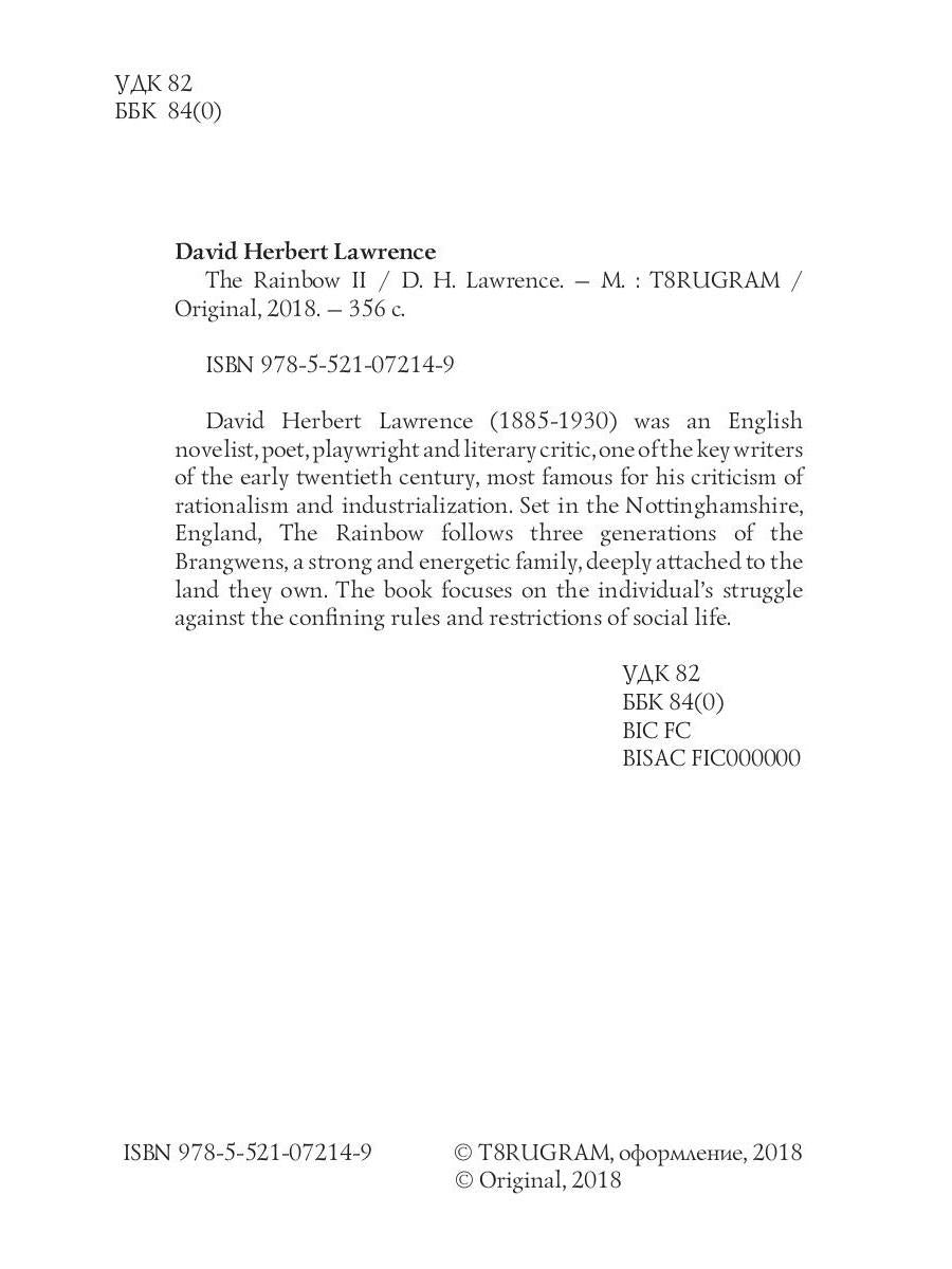 Handling time: 25 days Автор: Lawrence David Herbert, «The Rainbow 2 = Радуга 2: на англ.яз»: David Herbert Lawrence (1885-1930) was an English novelist, poet, playwright and literary critic, one of the key writers of the early twentieth century, most famous for his criticism of rationalism and industrialization. Set in the Nottinghamshire, England, The Rainbow follows three generations of the Brangwens, a strong and energetic family, deeply attached to the land they own. The book focuses on the individual's struggle against the confining rules and restrictions of social life.