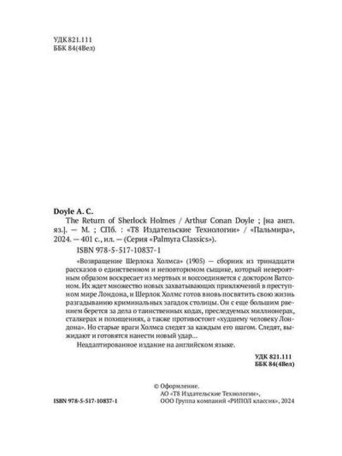 Handling time: 21 days Автор: Дойл Артур Конан, «The Return of Sherlock Holmes»: «Возвращение Шерлока Холмса» (1905) - сборник из тринадцати рассказов о единственном и неповторимом сыщике, который невероятным образом воскресает из мертвых и воссоединяется с доктором Ватсоном. Их ждет множество новых захватывающих приключений в преступном мире Лондона, и Шерлок Холмс готов вновь посвятить свою жизнь разгадыванию криминальных загадок столицы. Он с еще большим рвением берется за дела о таинственных кодах, преследуемых миллионерах, сталкерах и похищениях, а также противостоит «худшему человеку Лондона». Но старые враги Холмса следят за каждым его шагом. Следят, выжидают и готовятся нанести новый удар... Неадаптированное издание на английском языке.