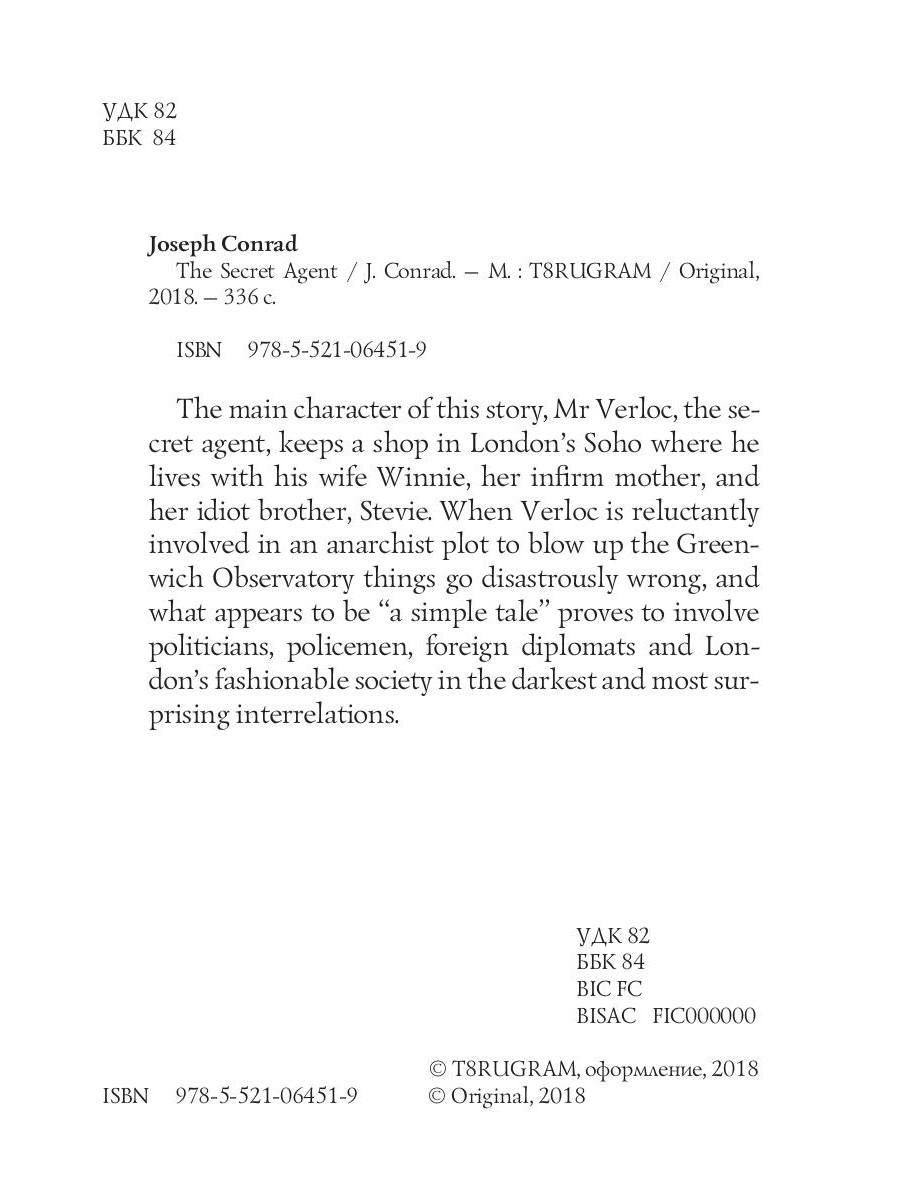 Автор: Conrad J., «The Secret Agent = Секретный агент: роман на англ.яз»: The main character of this story, Mr Verloc, the secret agent, keeps a shop in London's Soho where he lives with his wife Winnie, her infirm mother, and her idiot brother, Stevie. When Verloc is reluctantly involved in an anarchist plot to blow up the Greenwich Observatory things go disastrously wrong, and what appears to be "a simple tale" proves to involve politicians, policemen, foreign diplomats and London's fashionable society in the darkest and most surprising interrelations.