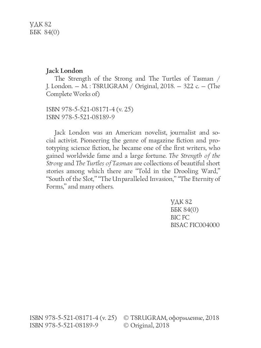 Автор: London Jack, «The Strength of the Strong and The Turtles of Tasman = Сила сильных и Черепахи Тасмана. Т. 25 (на английском языке)»: Jack London was an American novelist, journalist and social activist Pioneering the genre of magazine fiction and prototyping science fiction, he became one of the first writers, who gained worldwide fame and a large fortune. The Strength of the Strong and The Turtles of Tasman are collections of beautiful short stories among which there are "Told in the Drooling Ward," "South of the Slot," "The Unparalleled Invasion," "The Eternity of Forms," and many others.